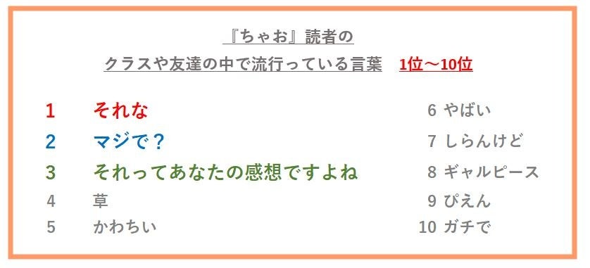 小学館『ぷっちぐみ』と『ちゃお』による「JS研究所」『JS流行語』調査イマドキ女子小学生(JS)に聞いた「クラスや友達のなかで流行っている言葉」ランキングを公開!!第一位は「それな」