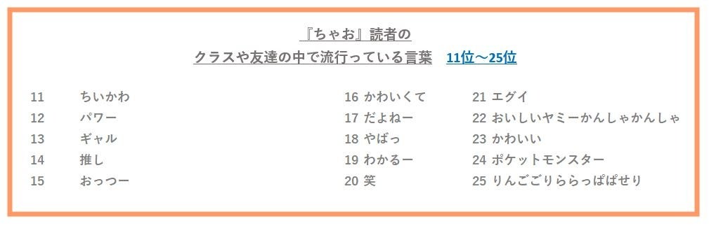 11位~25位にランクインした「流行語」の中では、「おいしいヤミーかんしゃかんしゃ」や、「りんごごりららっぱぱせり」などYouTuberが考案したネタやお笑い芸人のYouTubeが話題となったリズムネタで使われている言葉が目立っています。イマドキJSの会話や言葉には話題の動画コンテンツがトレンドの源になっている可能性が高いようです。