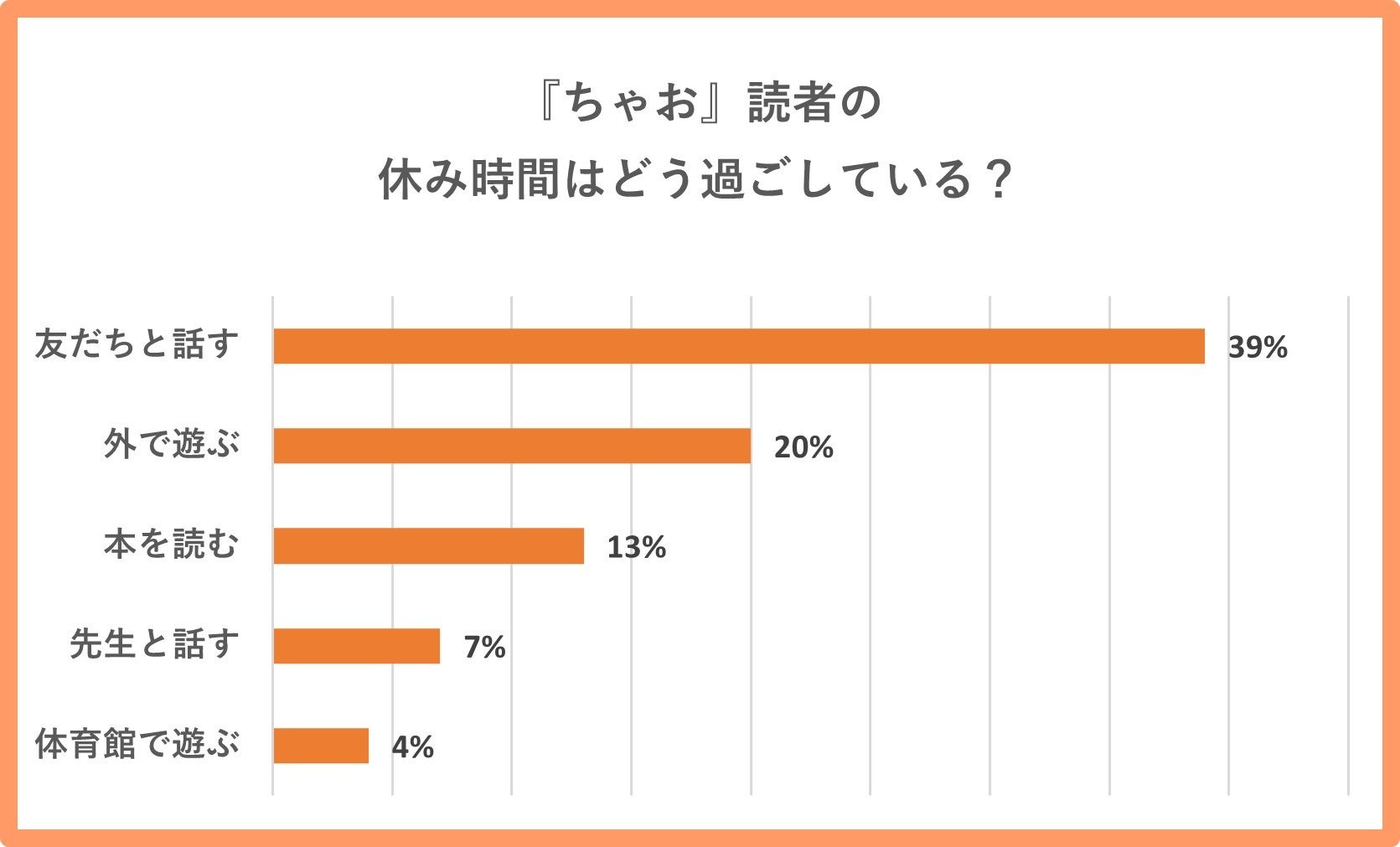 今回は『ちゃお』2023年5月号にて掲載、収集した「休み時間の過ごし方」と「流行語」に関するアンケート結果を発表いたします。イマドキの女子小学生(JS)たちは、学校やクラスの中でお友達とどんな言葉でコミュニケーションをとっているのでしょうか。アンケート回答から見えるJSのリアルを、編集長からのコメントともにレポートいたします。