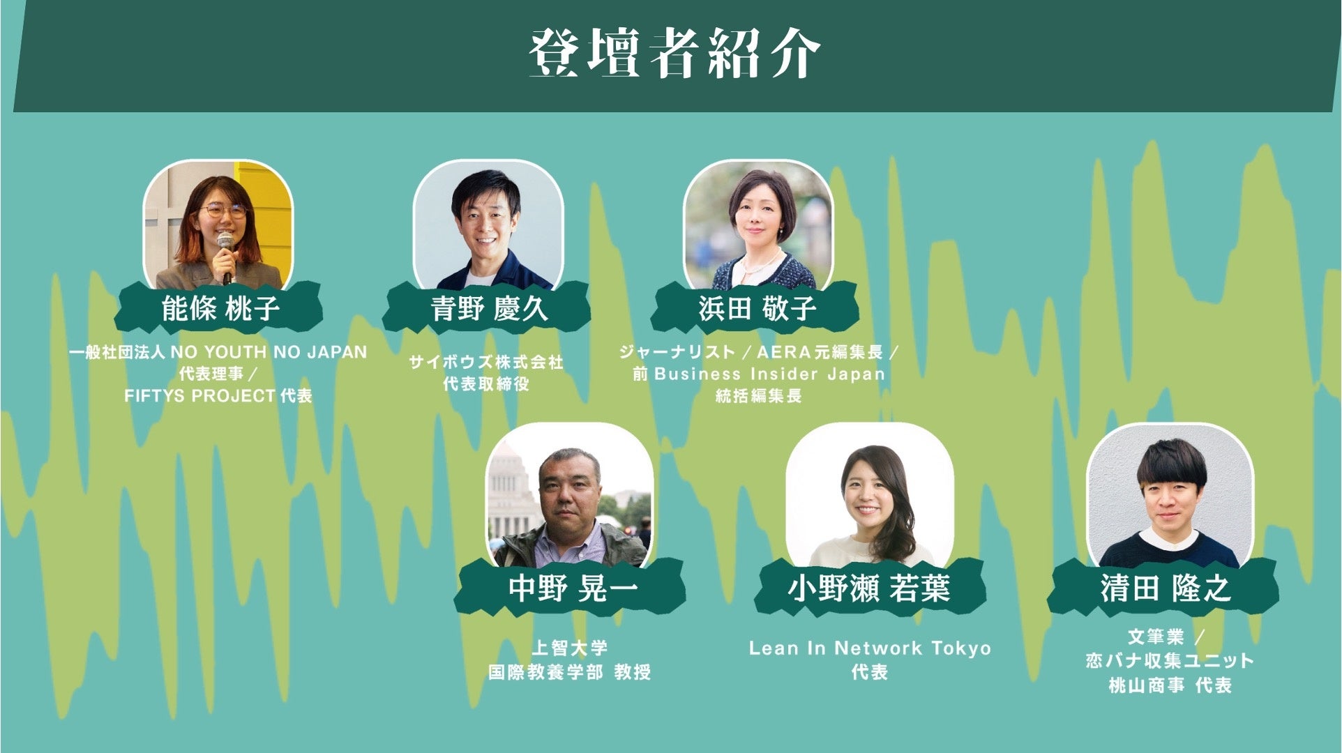 話題の『「男性中心企業の終焉』」を昨年出版されたジャーナリストの浜田敬子さんや、YouTubeで『男性のためのフェミニズム入門』シリーズを始めた上智大学教授の中野晃一先生、企業経営の視点からジェンダー問題にも鋭く切り込むサイボウズ社長の青野慶久さん、若い力を政治に反映すべく活動されている能條桃子さん、女性のエンパワメントに取り組むリーンイン東京 Lean In Tokyo新代表の小野瀬若葉さん、恋愛相談を通じてジェンダーの問題を浮き彫りにしている男性のホモソシアルを自身の経験から本にもされている清田隆之さんをお迎えしました。