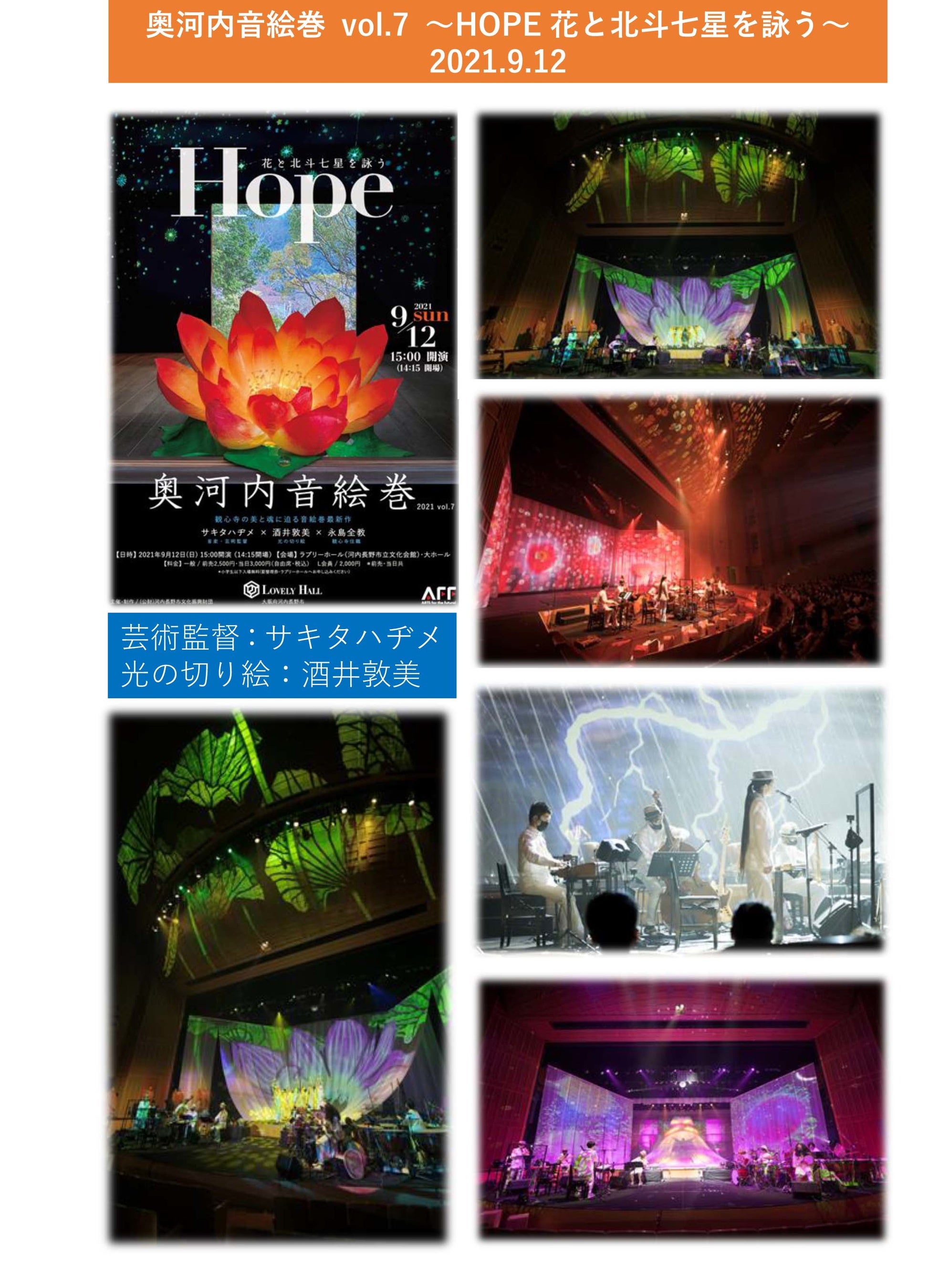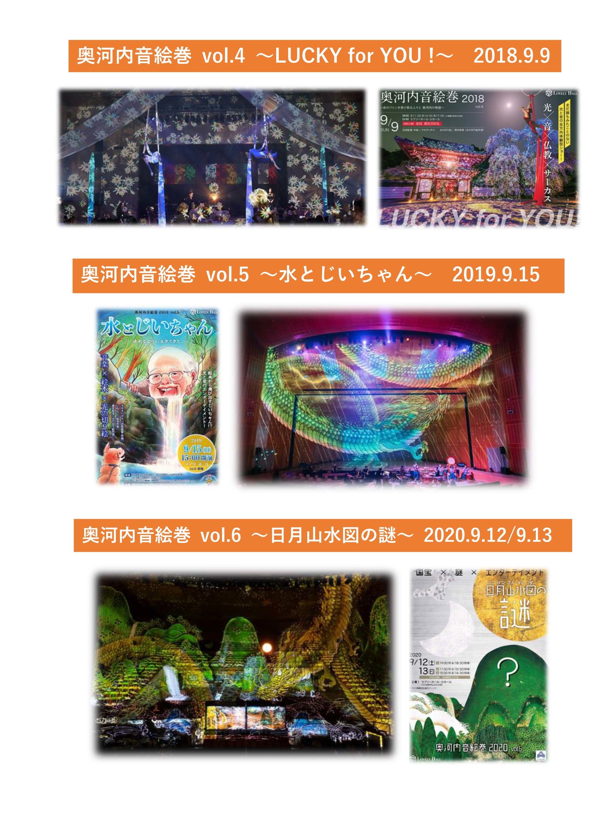 ◆「奥河内音絵巻」は、奥河内の自然、歴史、人々などから影響を受けた音楽家サキタハヂメが仲間たちと創り上げる音楽と光とビジュアルのタペストリー。コンサートやミュージカル、インスタレーション・・・どのジャンルにも属さない新感覚のエンターテイメントです。「ブルーマンやフェルザブルタに続くような、オフブロードウェイ進出も」とサキタ氏。