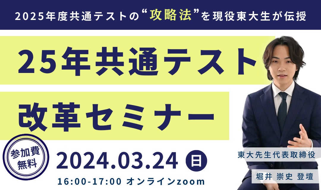 株式会社東大先生(本社:新宿区 代表取締役:堀井崇史)運営「オンライン家庭教師東大先生」では、「25年度共通テスト改革セミナー」を2024年3月24日(日)16:00よりオンラインにて開催いたします。