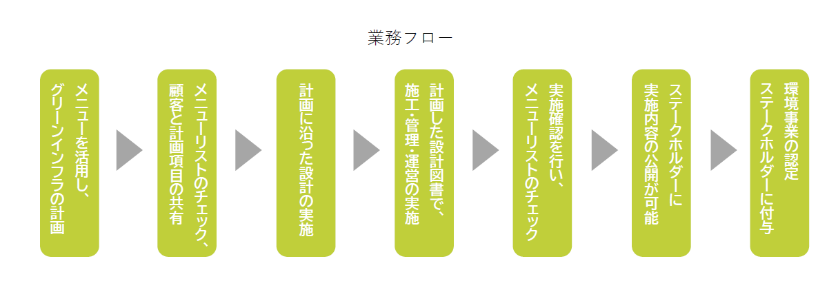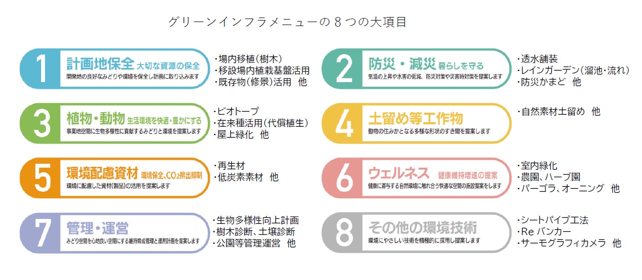 可視化したメニューは、造園・緑化関連分野における広範の技術・ノウハウを一覧表にし、8つの大項目で区分しています。案件ごとに、営業段階でメニューを活用し、採用技術項目を定め、設計・施工・管理・運営の実施に組み込むシステムです。メニューは計画的なグリーンインフラの実現を容易にするため、環境緑化計画における業務フローに沿ってまとめています。