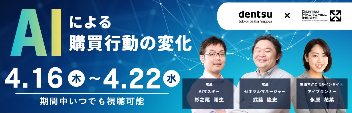 株式会社電通マクロミルインサイト(本社:東京都中央区、代表取締役社長:眞鍋 尚行、以下「電通マクロミルインサイト」)は、株式会社電通(本社:東京都港区、代表取締役 社長執行役員:松本 千里)と共催で開催したウェビナー「AIによる購買行動の変化」を、このたび再配信いたします。