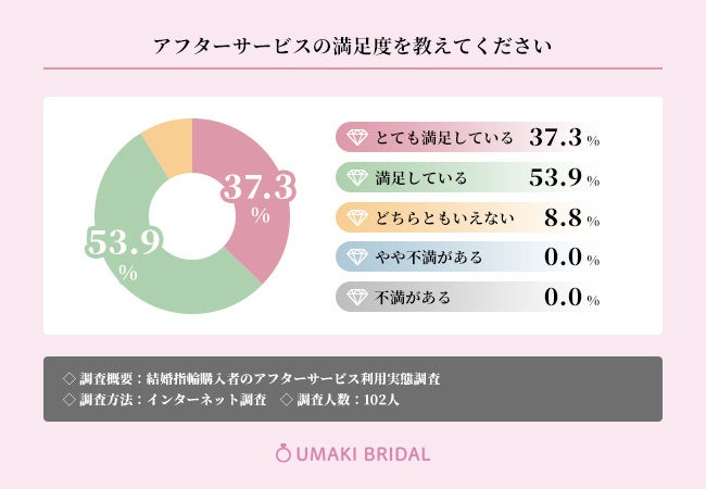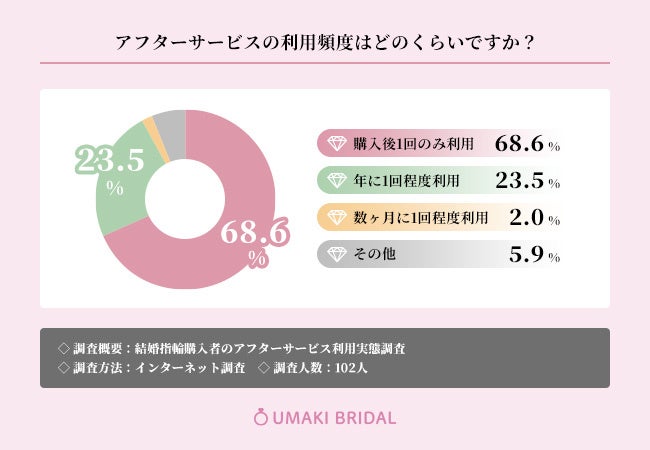 そこで今回、『UMAKI BRIDAL』(https://umaki-bridal.jp/)を運営する株式会社アイジュエリー・ウマキは、全国の20〜60代の男女102名を対象に「結婚指輪購入者のアフターサービス利用」に関するアンケートを実施しました。