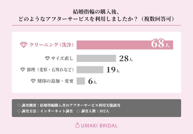 次に「結婚指輪の購入後、どのようなアフターサービスを利用しましたか?(複数回答可)」と質問したところ、最も多かったのは『クリーニング(洗浄)』で、68人の回答でした。続いて、『サイズ直し』(28人)、『修理(変形・石外れなど)』(19人)の順に利用者が多い結果となりました。