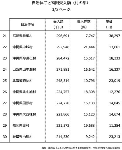 『ふるさと納税分析レポート』令和3年度ふるさと納税寄付額を「村」別に分析しました。1位芸西村、2位中札内村、3位昭和村の順となりました。