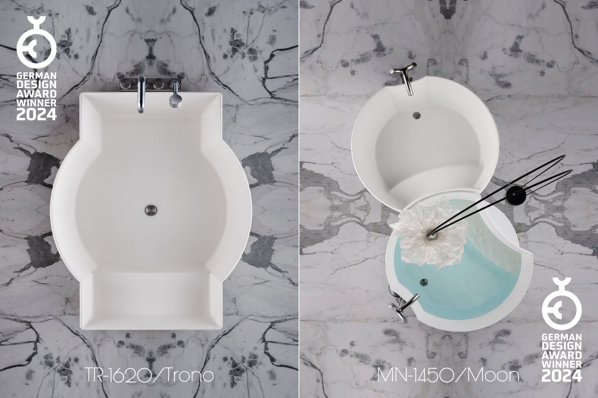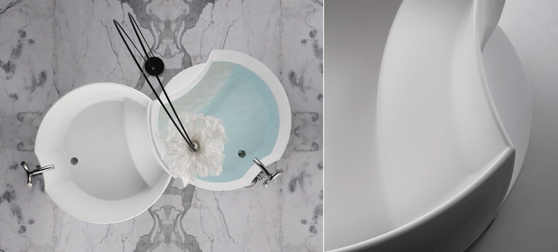 月の満ち欠けにインスパイアされたHIDEOのこのユニークなデュオ・バスタブのデザイン表現は、どのような場所でも主役になる。彫刻的な形状の2つのバスタブ本体は、重なり合うように配置することができ、独創的なデザインによって差別化されている。