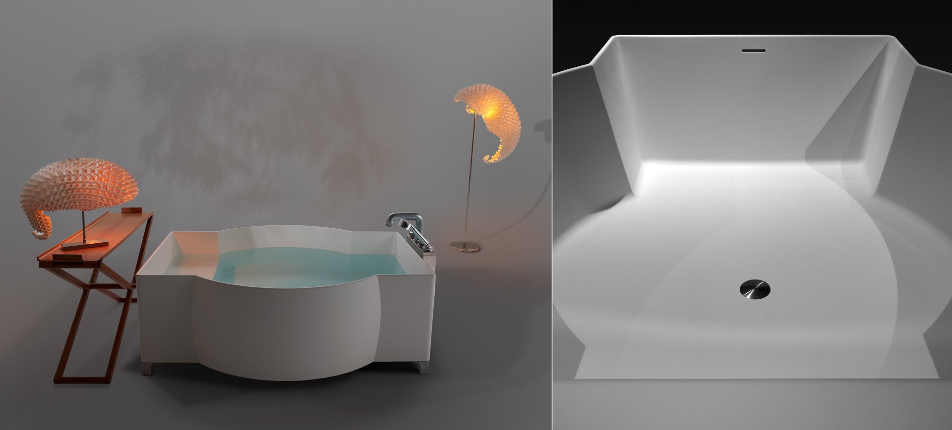 幾何学的でユニークなデザインが印象的である。浴槽内部の傾斜角度によって座り心地とリクライニングの快適さが約束され、さらに魅力的なバスタブとなっている。