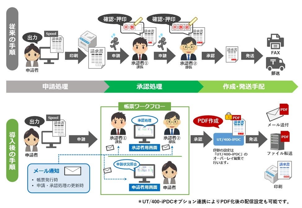 帳票ワークフロー Ver.2.0で申請や承認を行うデータは、出力データを一時保管するスプールファイル内に置くため、ワークフローの途中で改ざんを行うことはできません。