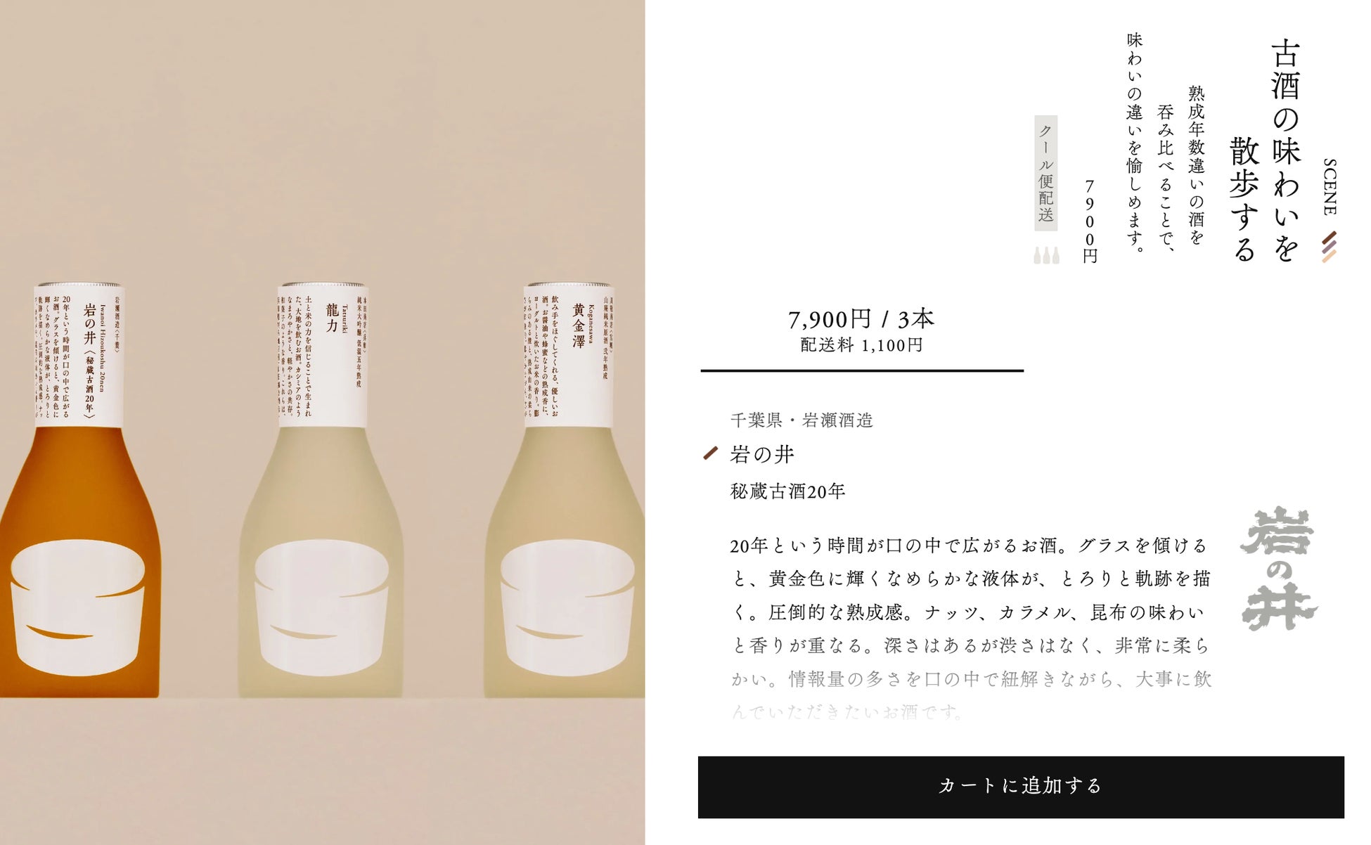 きょうの日本酒株式会社(本社:東京都港区、代表:濱道佐和子、以下当社)は1月21日(土)より、ブランド初の古酒である「岩の井秘蔵古酒二十年」を公式オンラインショップおよび表参道のグローサリーショップ「eatrip soil」店頭にて販売を開始しました。公式オンラインショップでは、「岩の井 秘蔵古酒二十年」「龍力 純米大吟醸 五年熟成」「黄金澤 山廃純米酒 弐年熟成」と味わいの異なる3種の古酒・熟成酒のセットにて販売します。