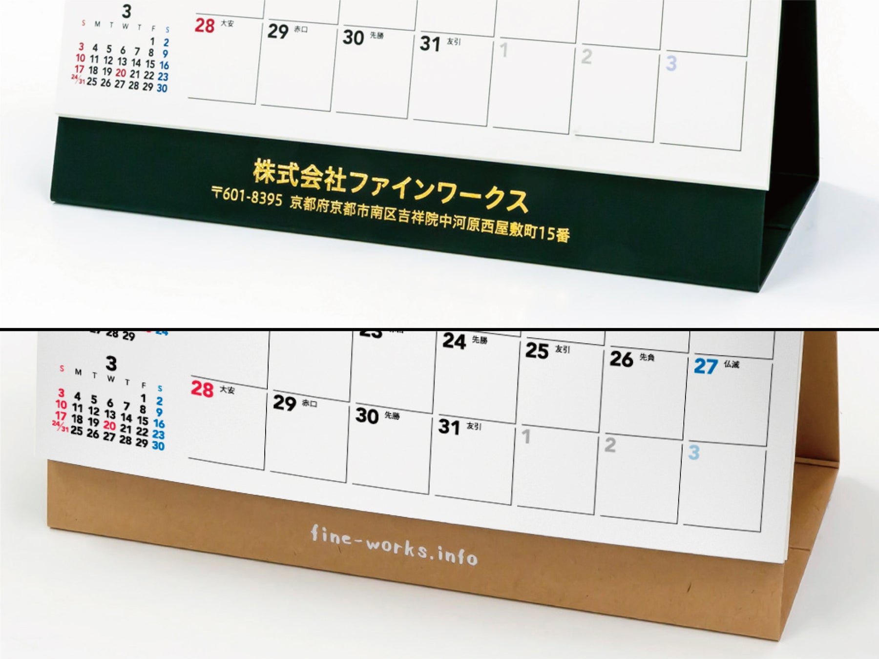 ファインワークスの名入れカレンダーでは、名入れは台紙部分への ※箔押し となり「注文時にテキスト入力」または「データ入稿」での対応となります。