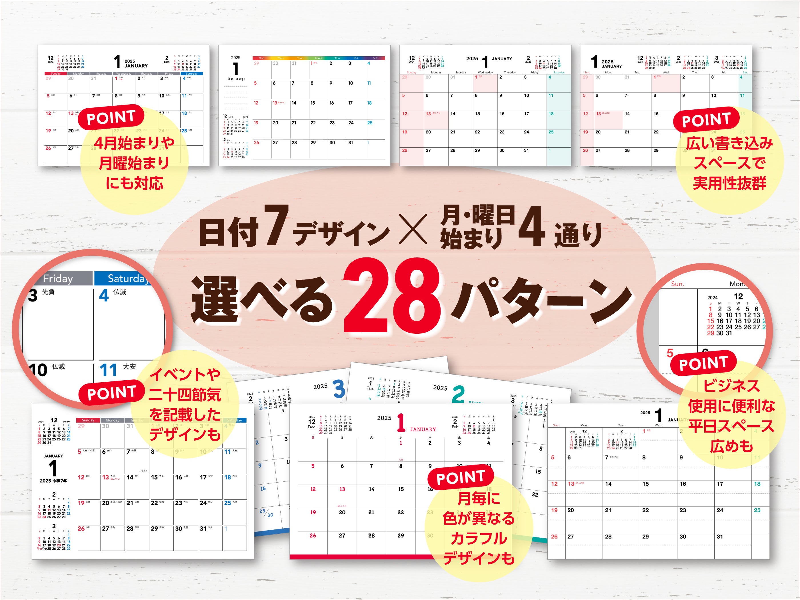 「祝日」だけの必要最小限の情報にとどめたデザインから、「祝日」「六曜」「二十四節気」「イベント」と情報盛りだくさんのデザインまで、ニーズに応じたバリエーションを展開しています。