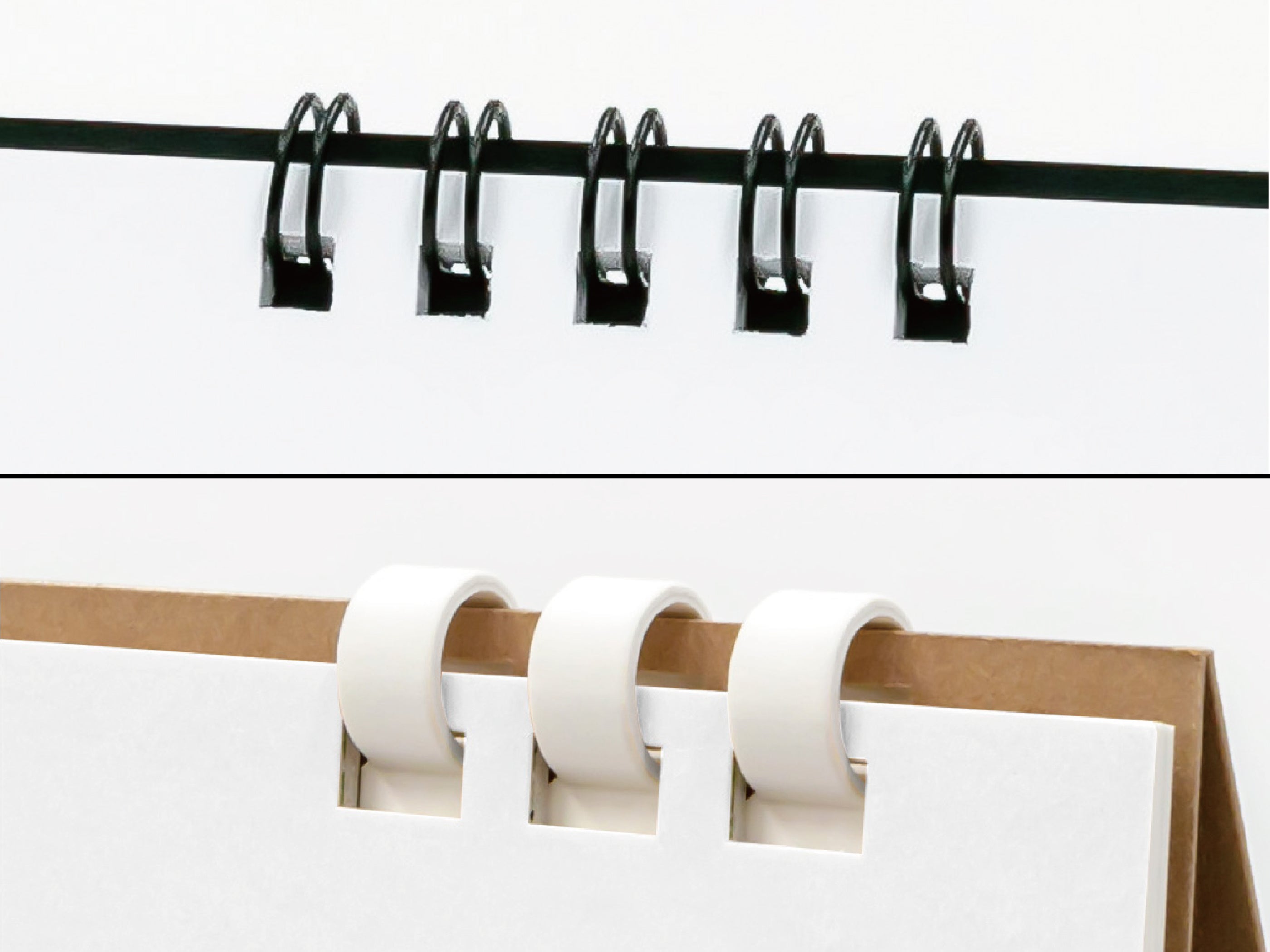 名入れカレンダーのリング仕様は、従来のスチールダブルリングに加え、新たに紙リングが加わりました。紙リングは日常使いでも問題のない強度で、リング色もホワイトを選ぶことでより紙製であることを強調することができます。