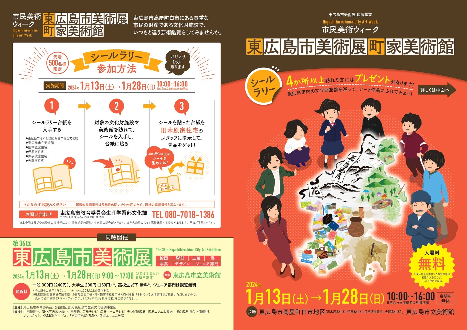 第36回東広島市美術展では、東広島市高屋町白市に点在する登録有形文化財(旧木原家住宅、伊原家住宅、保手濱家住宅等)で東広島市美術展の招待作家による作品展示を行います。