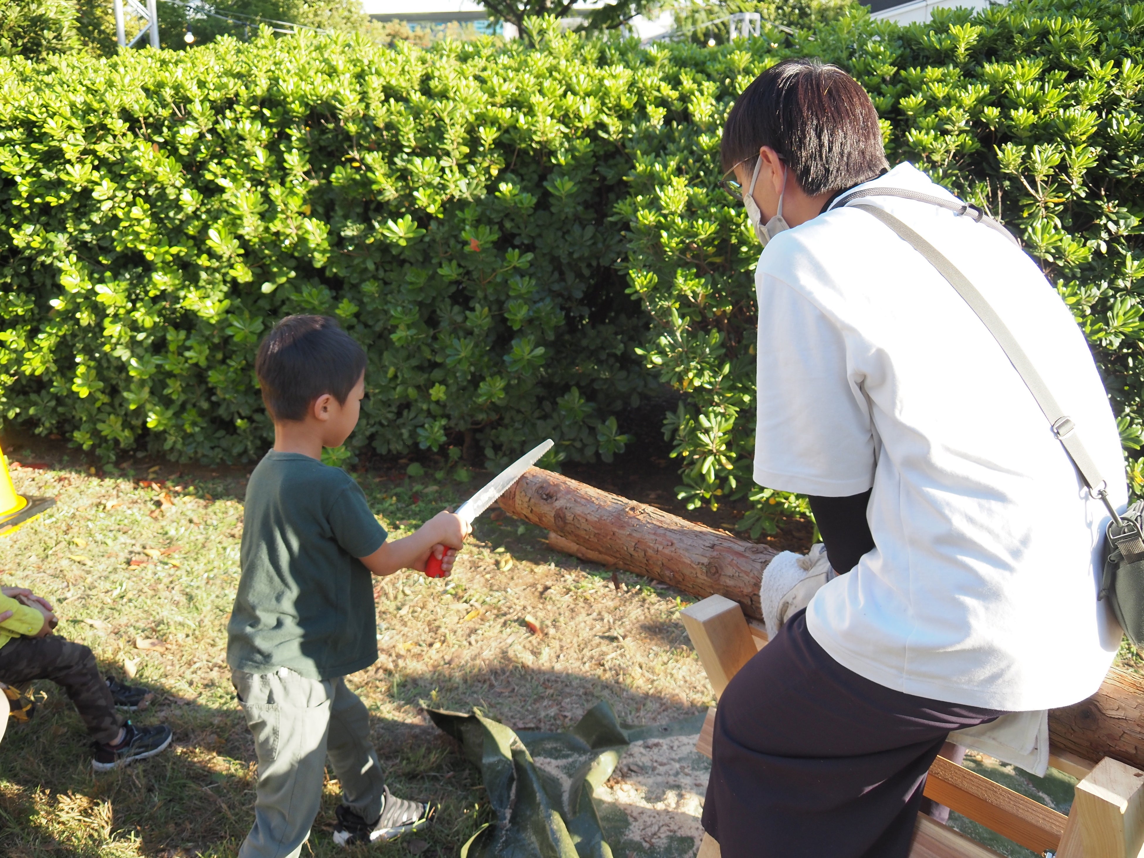 大きな丸太をノコギリを使って輪切りにカットする、丸太切りワークショップに参加して