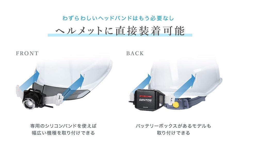 これまで、ヘルメットにヘッドライトを取り付けた際に、付属の布のヘッドバンドが劣化し、ヘッドライトがうまく固定できずに、動いたり、ズレたりするというお悩みを聞いていました。その対策として、布のヘッドバンドの上からガムテープや養生テープを貼り付けたり、シリコンのヘッドバンドやヘルメットクリップを使用して固定をする方が非常に多いです。ユーザー様の作業効率を少しでも向上させるために、ジェントスのオリジナルヘルメットである初代の【GRIT(グリット)】が誕生しました。