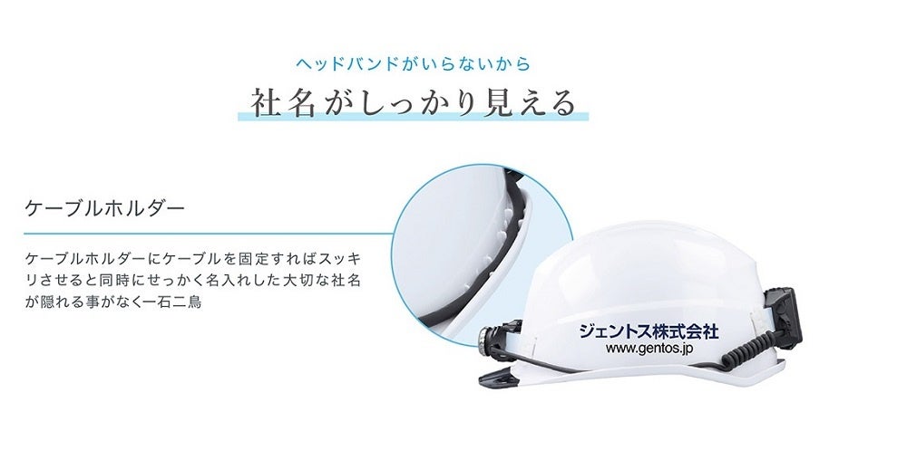 ヘッドバンドを使わないため、ヘルメットに名入れした社名などの情報が隠れず、しっかり見える。