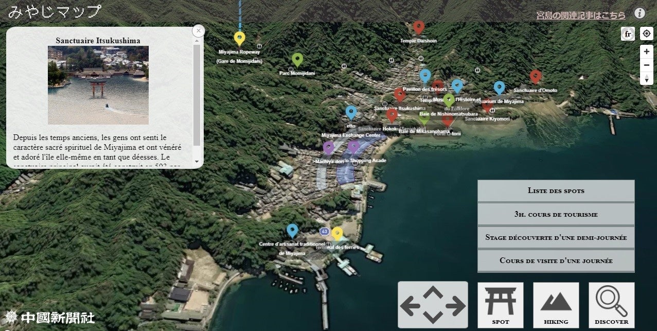 創建後1400年を超える歴史を持つ厳島神社や大鳥居、古い町並みが今も残る町家通り、スナメリが人気の宮島水族館(みやじマリン)など島内の観光スポット約20カ所を掲載。デジタルマップ上のピンを指すと、画像と解説を表示します。観光スポットの名称と解説は、日本語、英語、フランス語に対応しています。