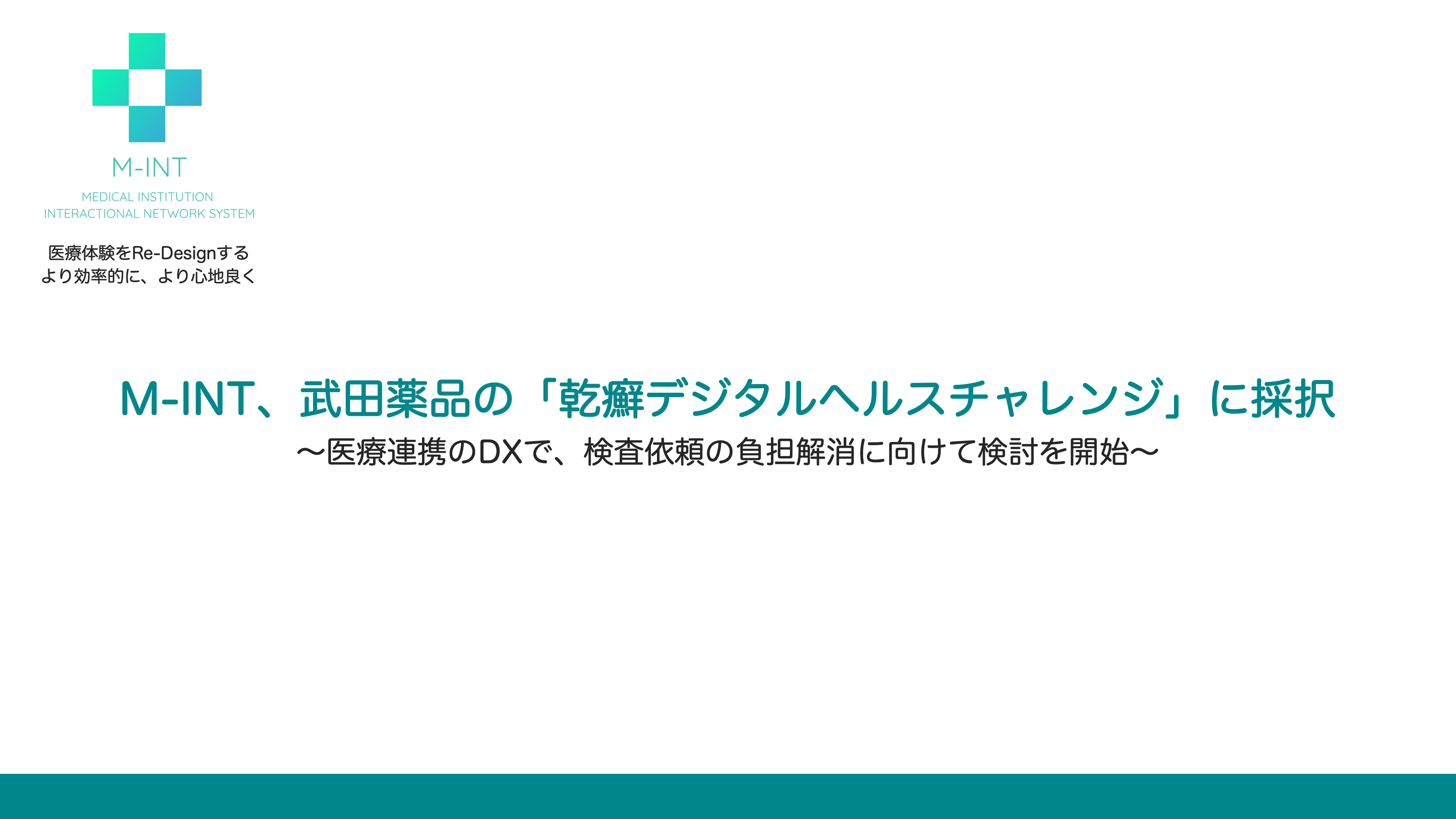 地域医療連携の促進を目指す株式会社M-INT(本社:東京都中央区、代表取締役:藤尾夏樹、以下「M-INT」)は、武田薬品工業株式会社(本社:大阪市中央区、以下「武田薬品」)が主催する、乾癬領域におけるデジタルヘルス・コーポレートパートナーシッププログラム 「乾癬デジタルヘルスチャレンジ」(以下、本プログラム)に採択されたことをお知らせいたします。