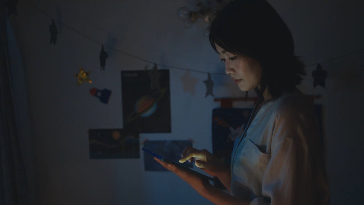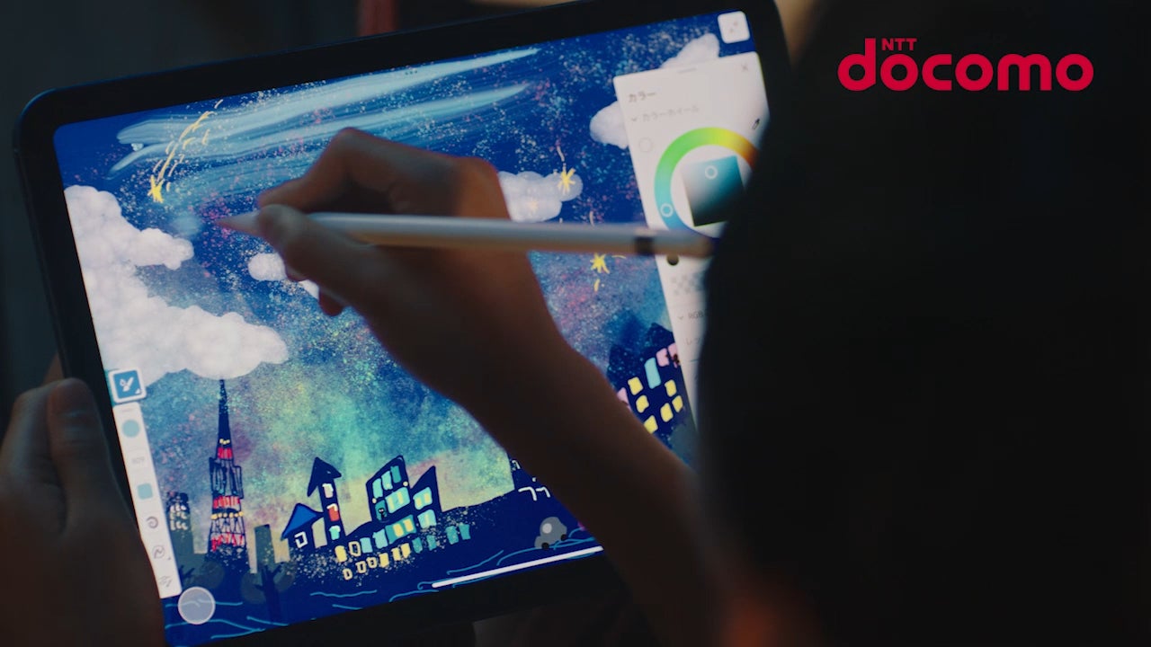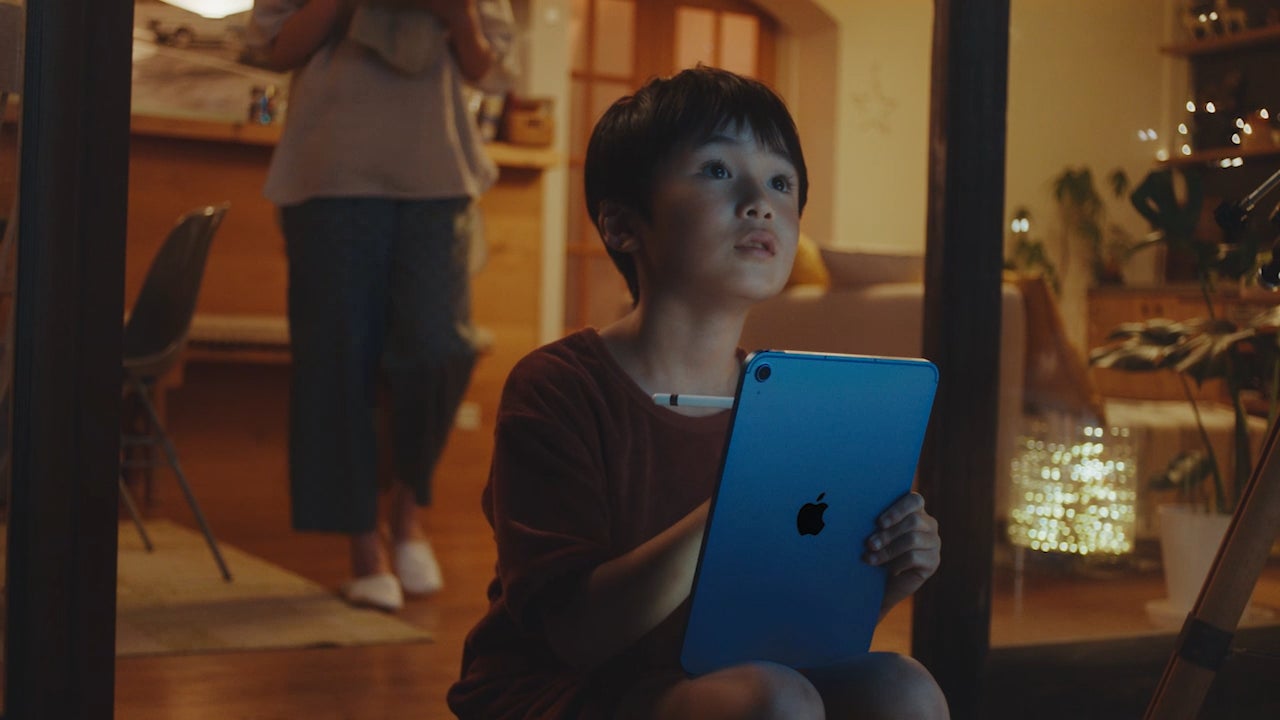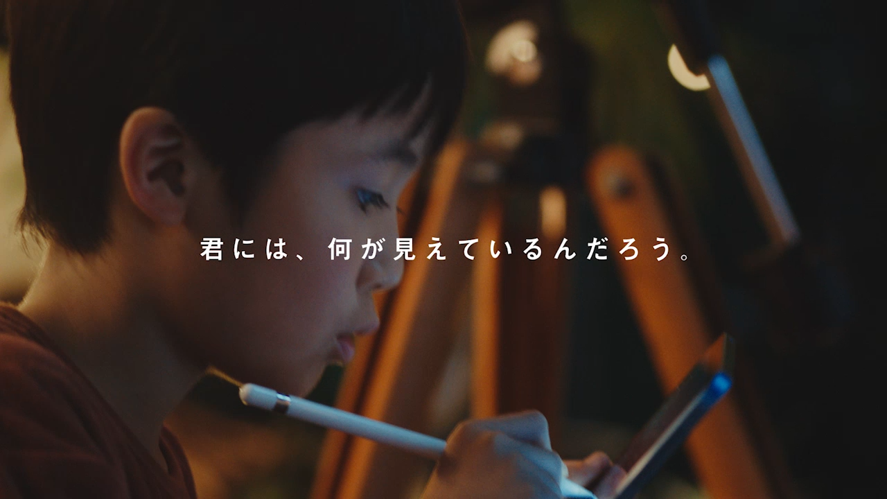 本CMは、一組の親子のある一夜の何気ないかけあいを描いています。庭から空を見上げ、慣れた手つきでiPadを使いこなし、夜空を描く少年。iPadとApple Pencilならではの機能で繊細な雲や星、空の霞を生み出し、刻一刻と移ろう夜空を夢中で描き続けます。そろそろ部屋に入るよう母親が声をかけると「あと20分!」とまだまだペンが止まらない様子。その姿に思わず呆れる母親でしたが、寝付いた彼のそばにあるiPadを片付けようと手に取ると、そこに広がる作品に驚かされます。絵を拡大していくと、そこには月面からこちらに向かって手を振る男の子や町並み、家の中には両親の姿があり、宇宙人も人間もみんな手を取る温かい世界が広がっていました。我が子が持つ無限の想像力や可能性に驚かされるとともに、誇らしく我が子を見つめる母親を、月明かりが優しく照らします。