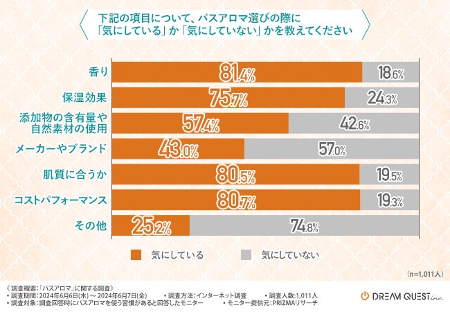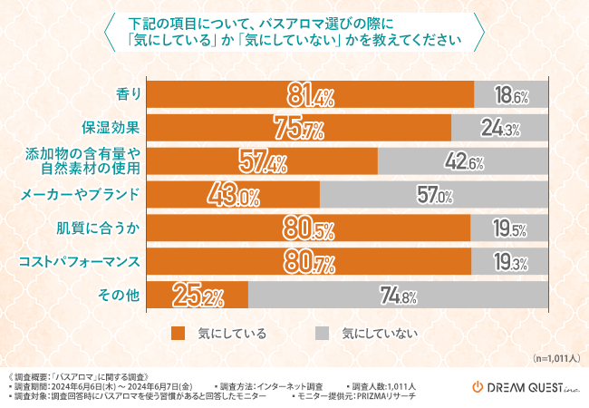 そこで、「下記の項目について、バスアロマ選びの際に「気にしている」か「気にしていない」かを教えてください」と質問したところ、各項目について気にしていると回答した割合は以下のような結果となりました。