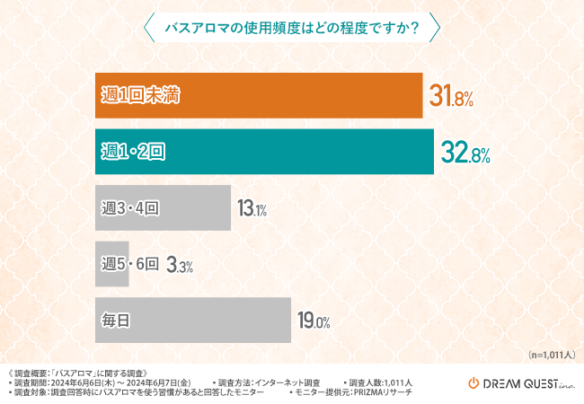 はじめに、「バスアロマの使用頻度はどの程度ですか?」と質問したところ、『週1回未満(31.8%)』『週1・2回(32.8%)』『週3・4回(13.1%)』『週5・6回(3.3%)』『毎日(19.0%)』という回答結果になりました。
