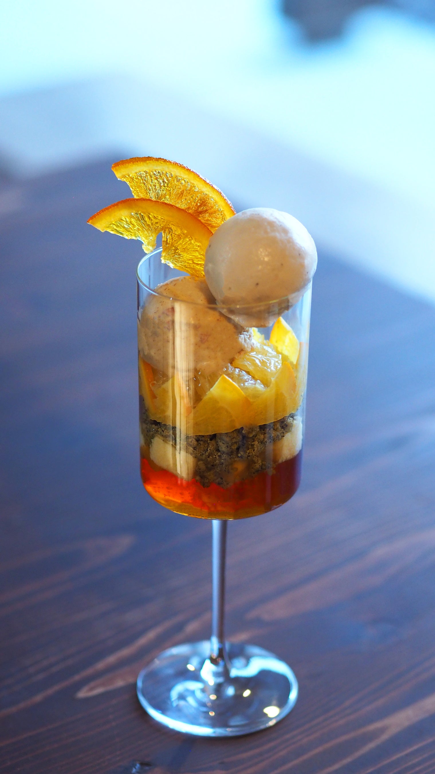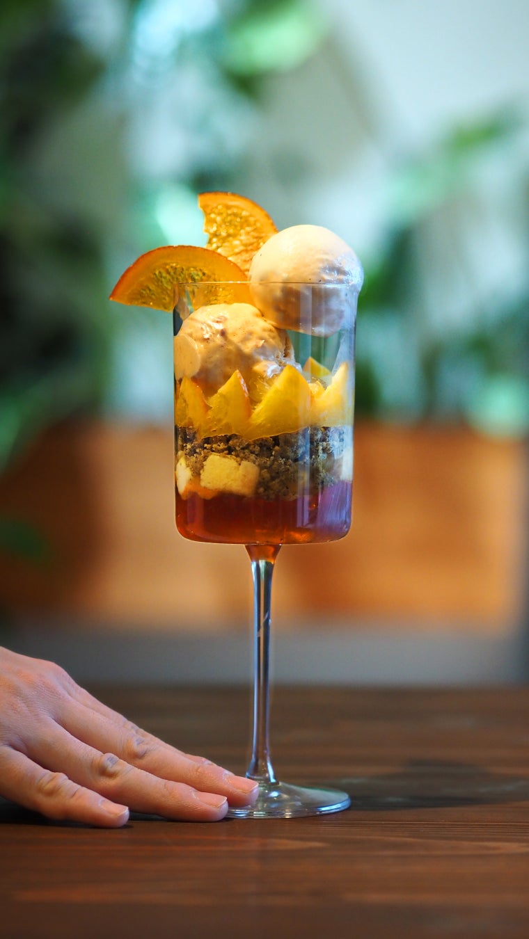 砂糖漬けしたオレンジコンフィに、和紅茶アールグレイ、マスカルポーネチーズ、シナモンの3種のジェラートを合わせて。伊予柑、和紅茶のクランブルクッキー、ヨーグルト、チーズケーキ、柑橘ジャム、紅茶のゼリーが層になり、濃厚な味わいと爽やかな風味が調和。すべて自家製のパフェは、単体でも、食後のデザートとしても満足感の高い一品に仕上がっています。香り高い和紅茶のチャイと合わせてお楽しみください。