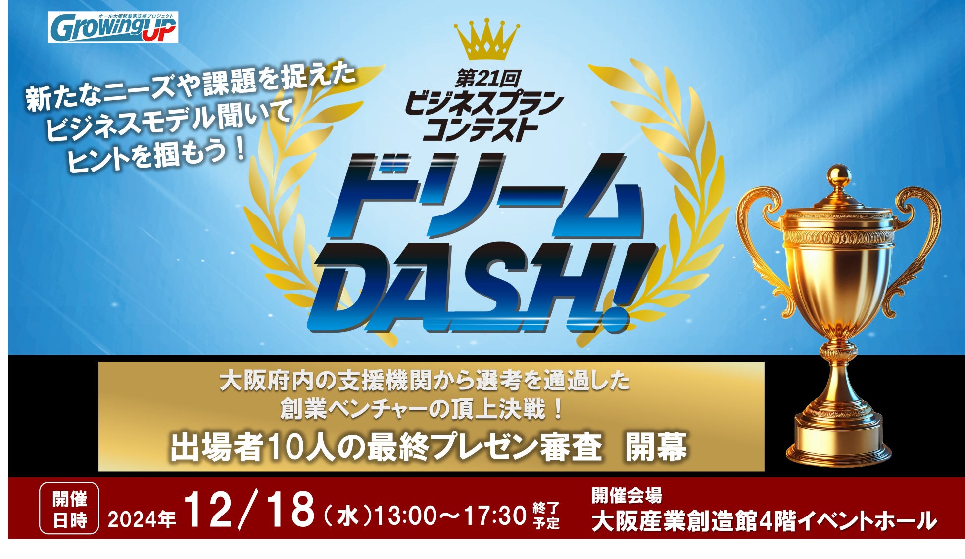 大阪起業家グローイングアップ事業(主催:公益財団法人大阪産業局/共催:大阪府)では、社会課題・ニーズを独自の視点で的確に捉え、その解決に向けた起業家の強い使命感のもと、既存の製品・サービスを上回る価値を顧客へ提供するとともに、持続安定的な収益、経済への好循環・波及効果が期待できるビジネスプランを発掘する場として、毎年【ビジネスプランコンテスト ドリームDASH!】を開催しています。