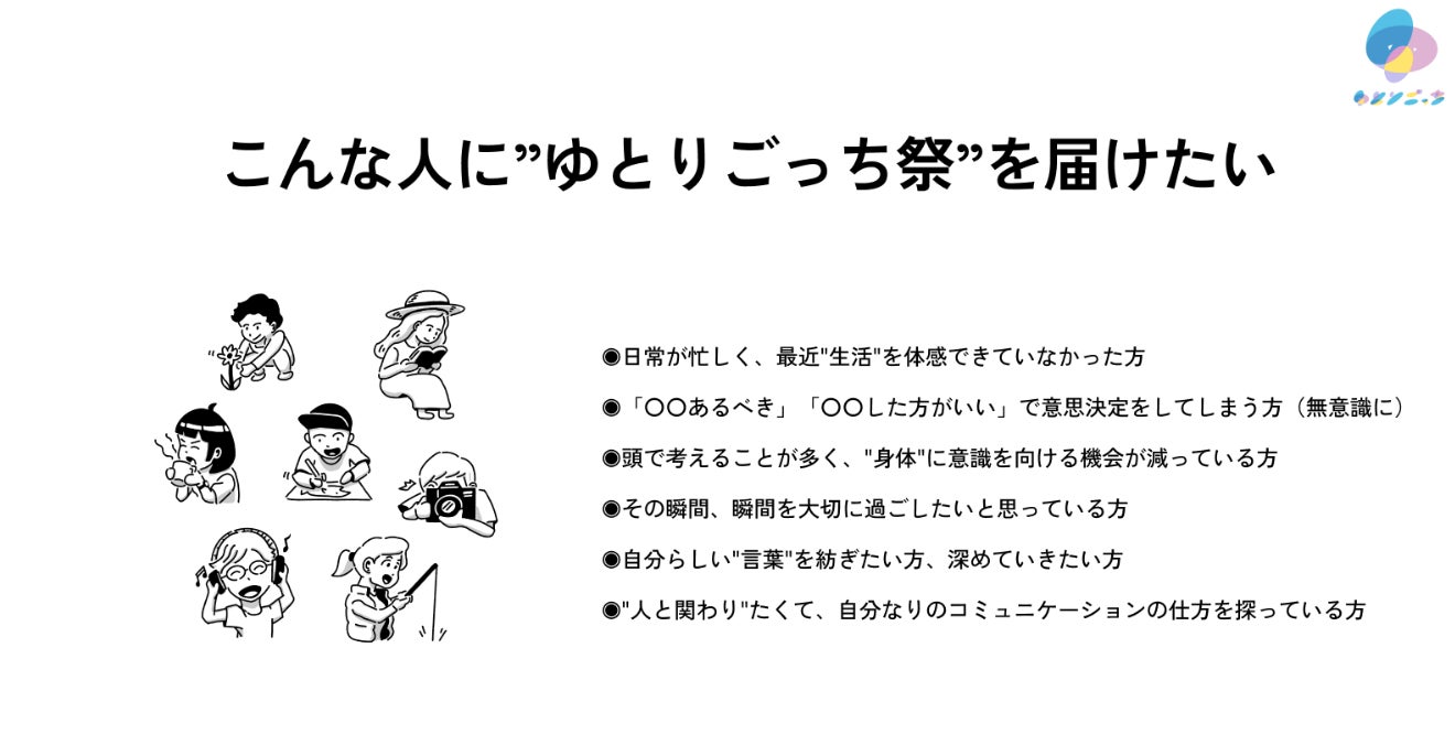 でもわたしたちには、身体や感覚、意識、感情があって、内側から溢れ出るわたしだけの”声”がきっとあるはずなんです。普段の社会の中だと感じることが難しいこともあるでしょう。だからそんな自分にゆっくり向き合える場所を作るために、このゆとりごっち祭はあります。