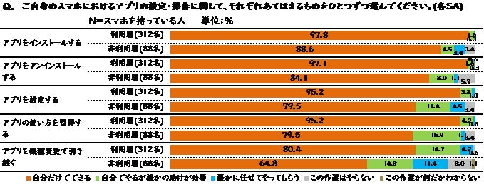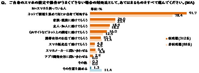 一方、「その作業を諦める」の回答割合には利用層(1.3%)、非利用層(11.4%)と大差がみられます。スマホでの設定や操作がうまくできない場合、非利用層にはその作業自体を諦めてしまう人が多いことがわかりました。