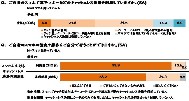 スマホ保有者のうち78.0%がスマホでキャッシュレス決済を利用(=利用層)しており、22.0%は非利用層であることがわかりました。スマホの設定や操作に関して上記の利用層と非利用層を比べると、自分で「ほとんどできる」と回答したのは、利用層では88.8%でしたが、非利用層では68.2%にとどまりました。利用層に比べて非利用層には、スマホの設定や操作が得意でない人が多く、そのことがスマホへのキャッシュレス決済アプリの導入を妨げる一因となっています。