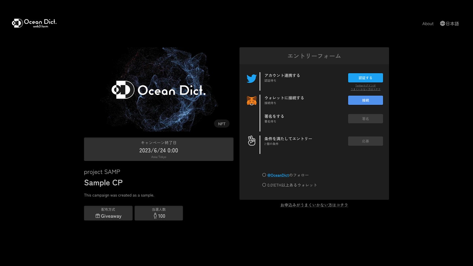 ocean dict. の「web3 form」は、Giveaway / Airdrop / Allowlistなど、イベントの実施をサポートするための様々な機能を実装するweb3に特化した申し込みフォームです。フォーム入力の自動化や申し込み条件の自動確認をはじめ、プロジェクトの実施者と申し込みをする参加ユーザー双方がそれぞれ少ない工数で利用できる各種機能を構築しています。