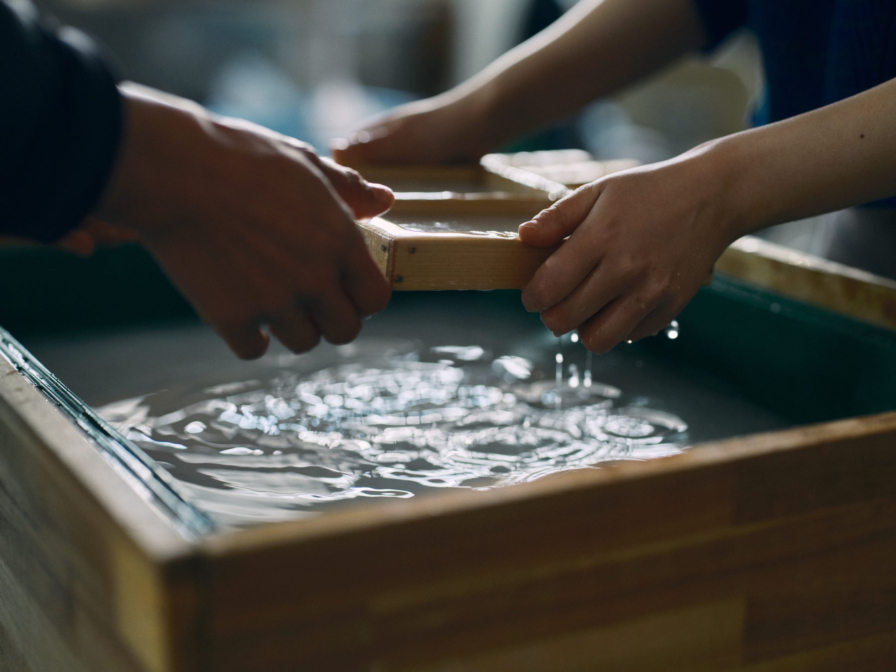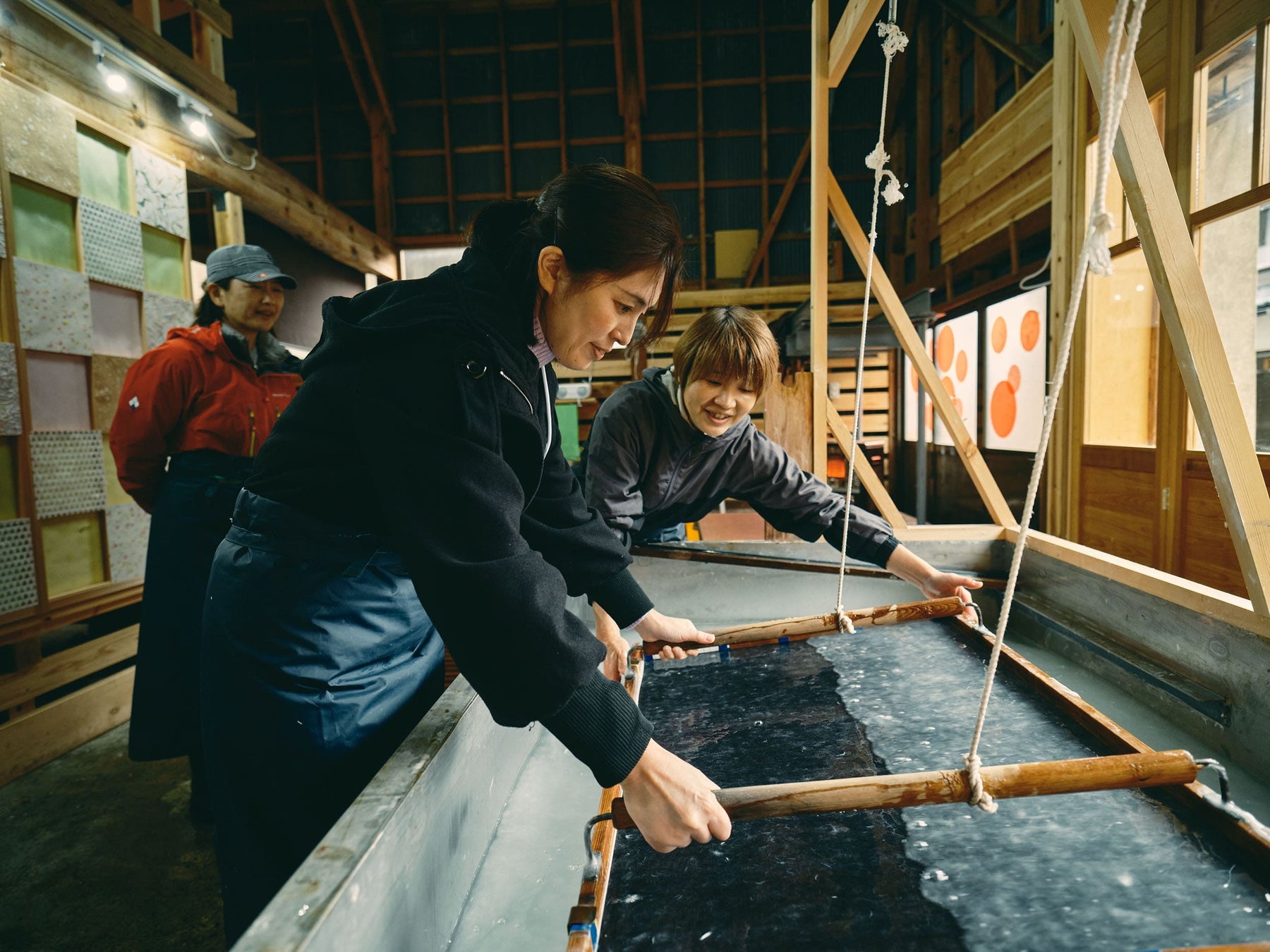 滞在中は、周辺の和紙工房を訪れて職人の技に触れながら、本格的な和紙漉き体験にご参加いただけます。また、産地を巡った体験をお持ち帰りできるよう、お宿では和綴じなどのワークショップをお楽しみいただけます。