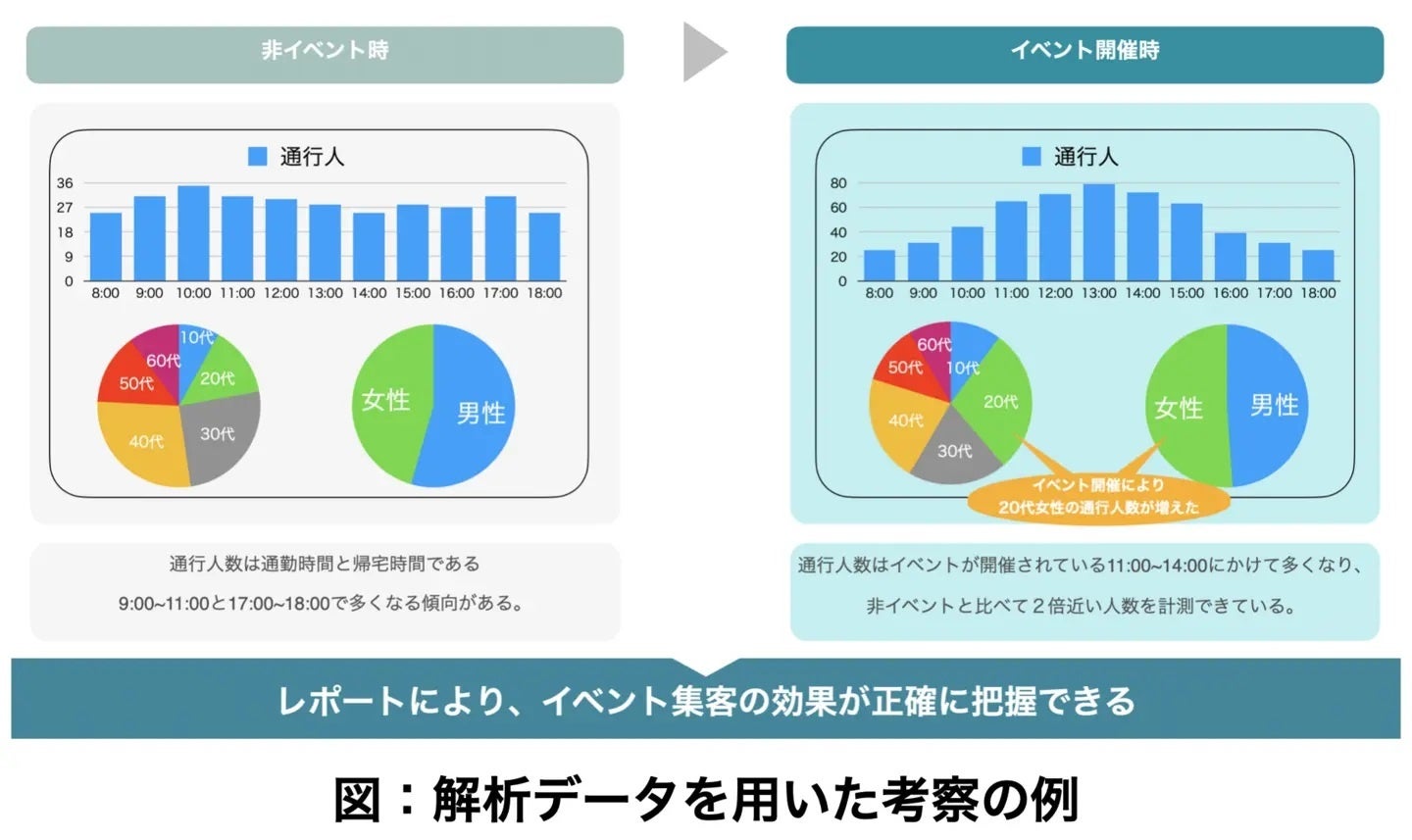 阪急大阪梅田駅改札すぐという公共性の高い施設内において、来場者数や属性、人の流れ等を定量的に分析・フィードバックすることで、今後の効果的なイベント企画立案はもとより、人々が交流する街づくりの最適化に向けた戦略的な意思決定、安全安心な施設運用にご活用いただけます。
