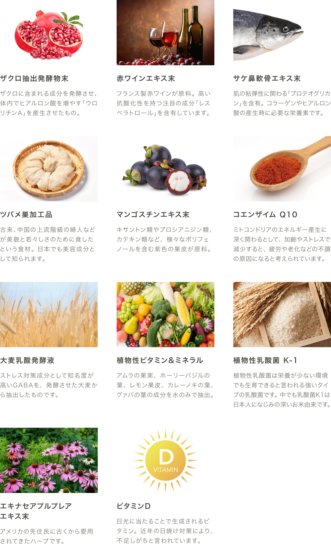 美容や健康をサポートする成分として、他製品では主要な成分として単独で用いられており、かつNMNとも親和性があるものを配合しました。