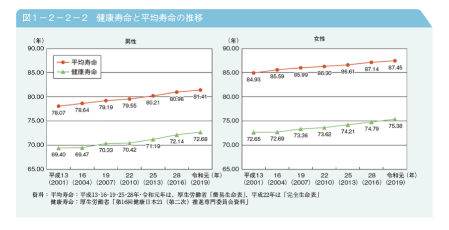 医療の発達により平均寿命が伸長し、「人生100年時代」と表現されるように多くの人が100年以上生きられる未来が近づいています。一方で、生きている期間としての寿命と、日常生活に制限のない期間としての健康寿命には男女共に約10年のギャップが存在します。長く生きたとしても、多くの人が最後の約10年を生活に支障を感じながら過ごす可能性があるのです。