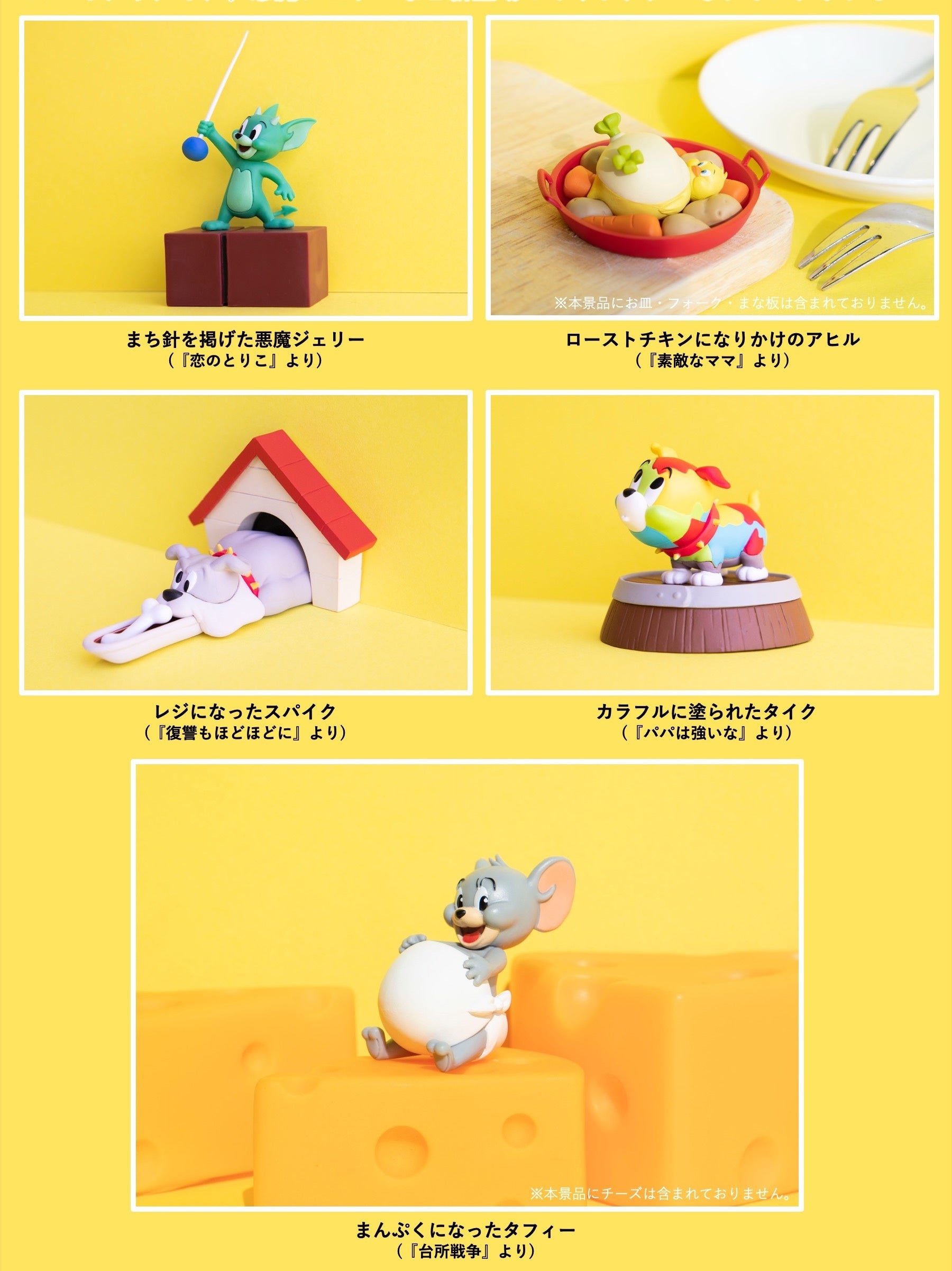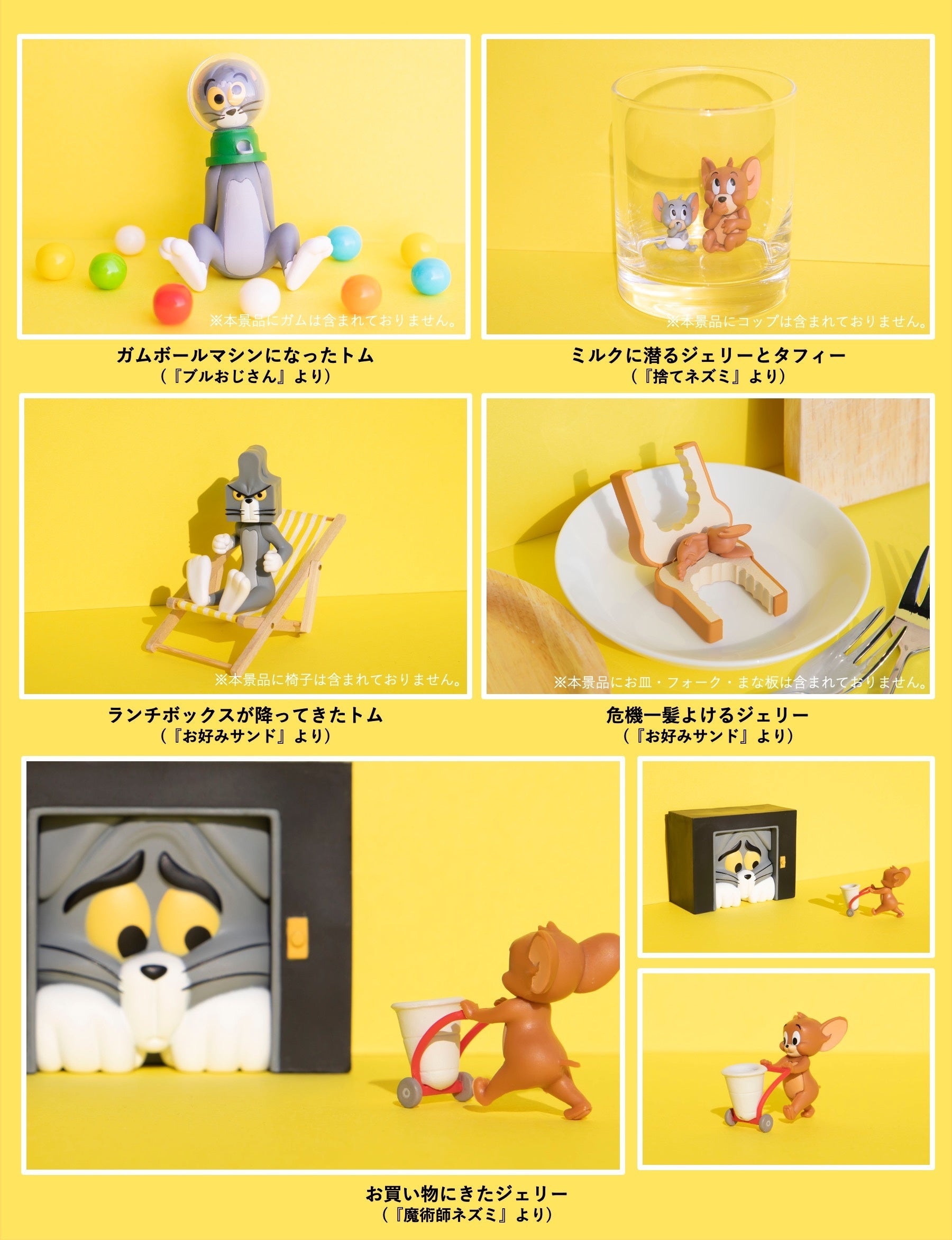 アニメ「トムとジェリー」のあのシーンが立体化!!シーンにあわせて飾るともっと楽しめるデザインが盛りだくさん!トムとジェリーやおなじみのタフィーはもちろん、スパイクやタイク、悪魔ジェリーなど新登場のキャラクターもラインナップ!
