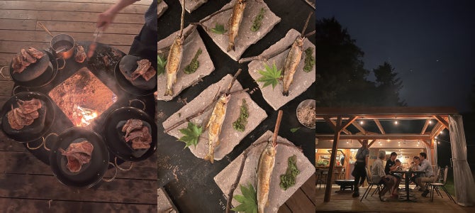 スイス製の薪火調理台「Yagoona Fire Bowl」を全員で囲み、ピットマスターが薪火を操りながら調理します。その料理にまつわるストーリーを語りながら、味覚だけではなく五感を刺激する森の中のディナーです。