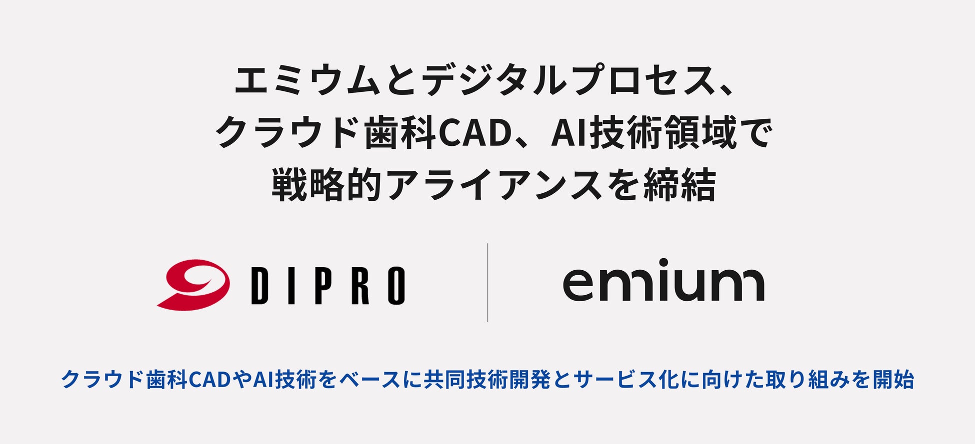 エミウム株式会社(本社:東京都新宿区、代表取締役:稲田雅彦、以下「当社」)は、富士通グループ企業のデジタルプロセス株式会社(本社:神奈川県川崎市、代表取締役:吉野 琢也、以下「デジタルプロセス」)と戦略的アライアンスを締結し、エミウムのクラウド歯科CADやAI技術をベースに共同技術開発とサービス化に向けた取り組みを開始いたします。
