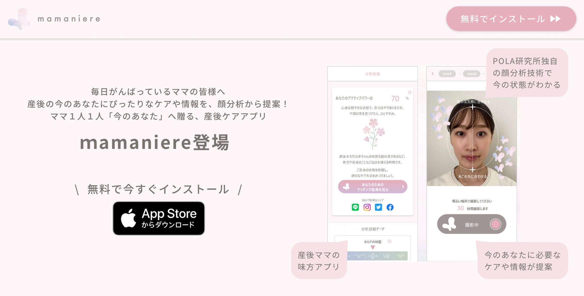産後ケアアプリ「mamaniere」アプリでは、ポーラのパーソナライズドサービスブランド「APEX(アペックス)」で実施してきた肌分析の技術を応用してできた分析技術で、今の状態に合った産後特有の悩みを解決するケア情報や、月齢に合わせた育児情報を提案されています。