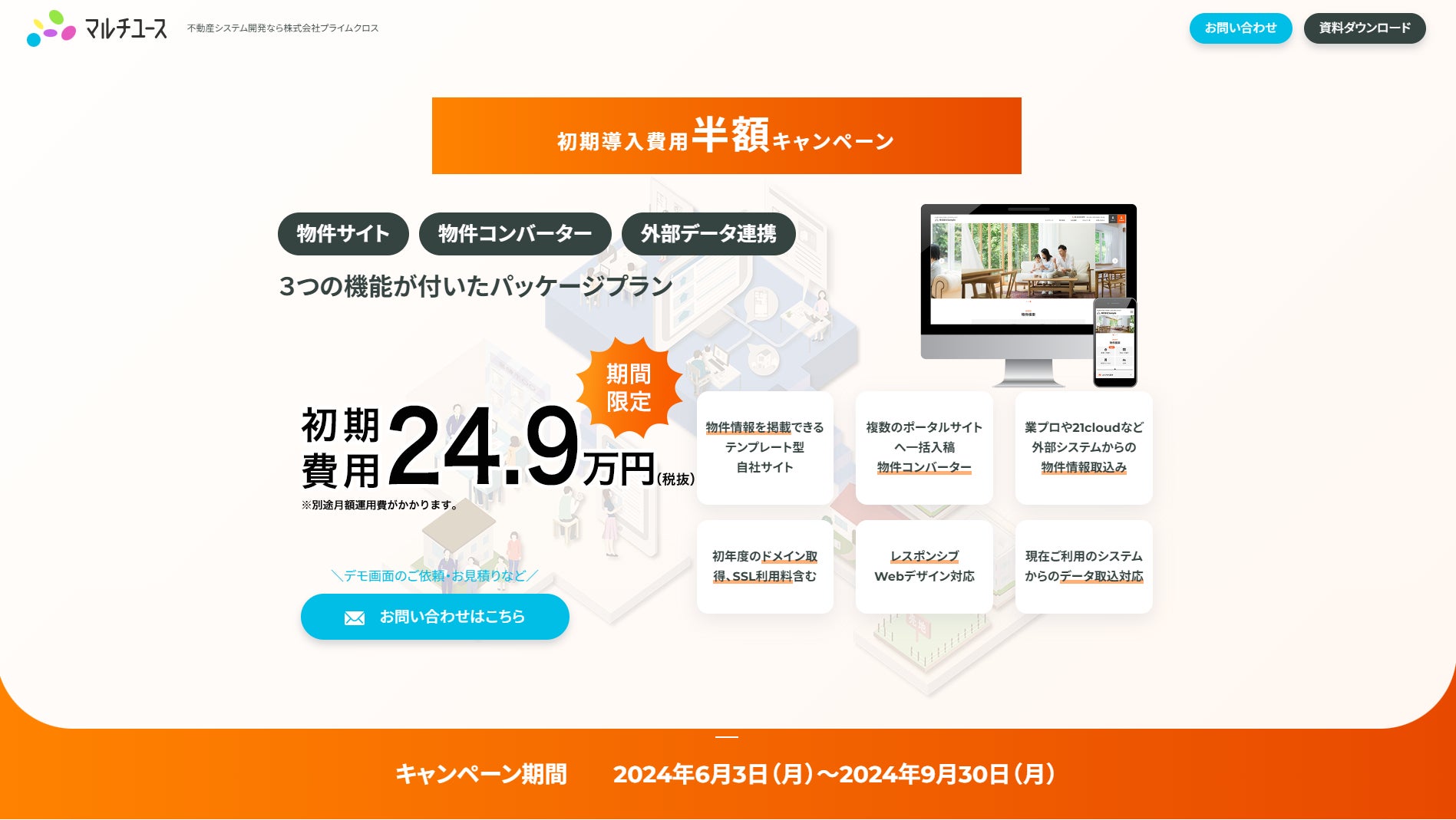 株式会社プライムクロスは、売買仲介向けに「物件コンバーター」「物件サイト」「外部データ連携」の3つの機能がパッケージになったマルチユース「スモールスタートパッケージ」を、キャンペーン期間に申し込みいただいたお客様限定で、初期費用半額にてご提供させていただきます。