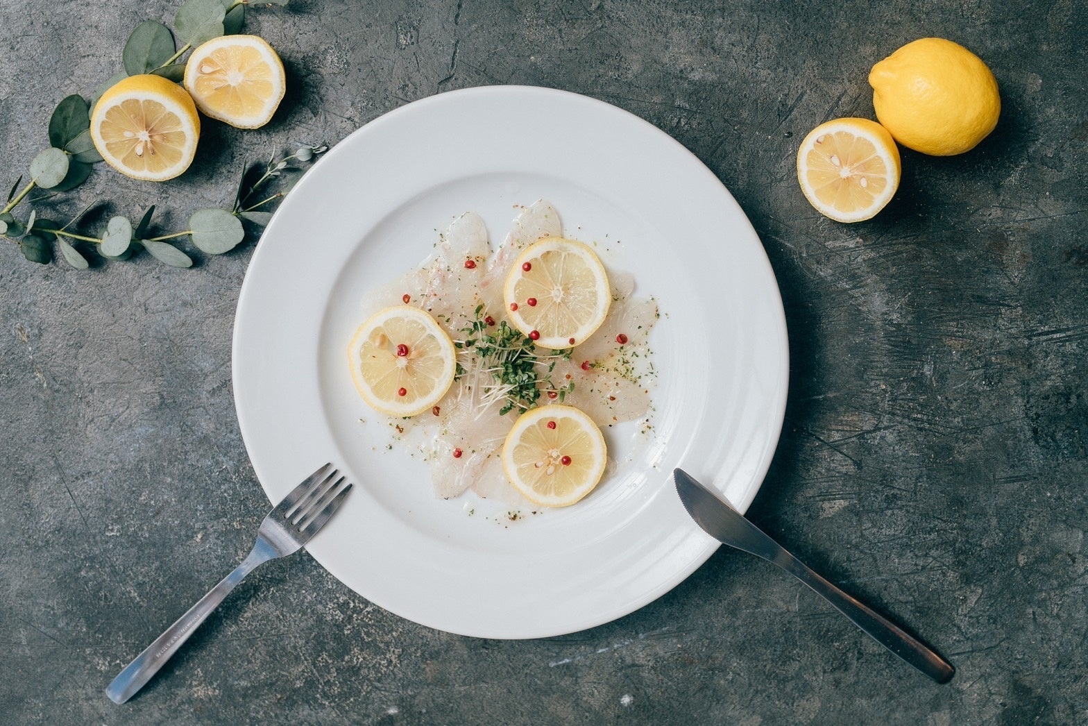 お好きな白身魚、カイワレ、レモン、ピンクペッパー