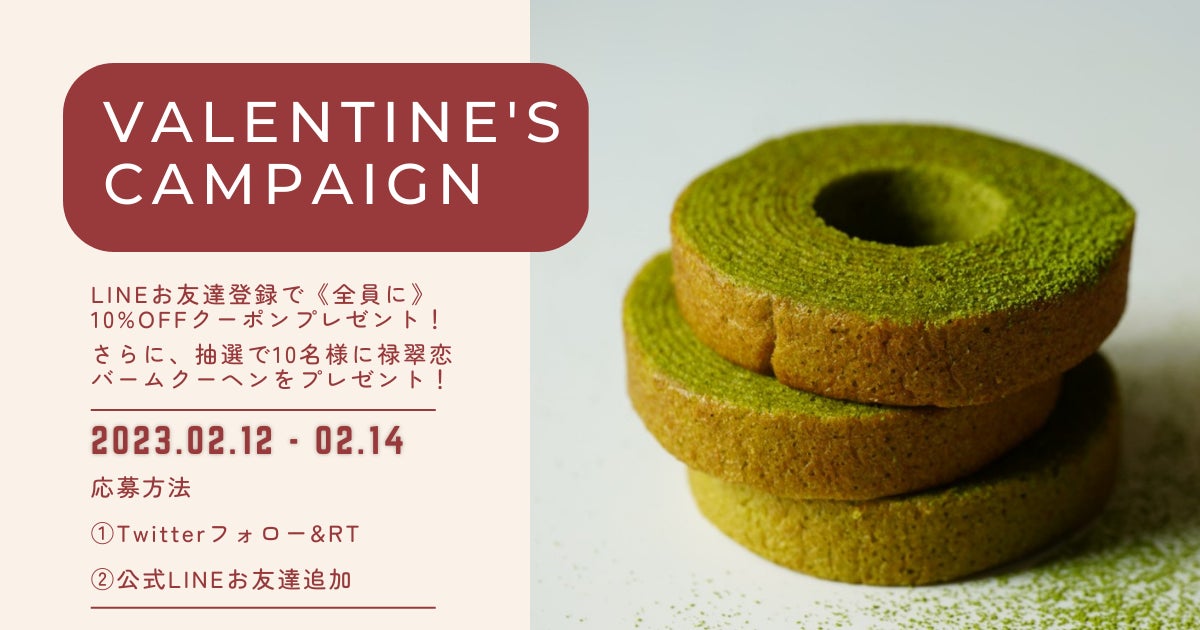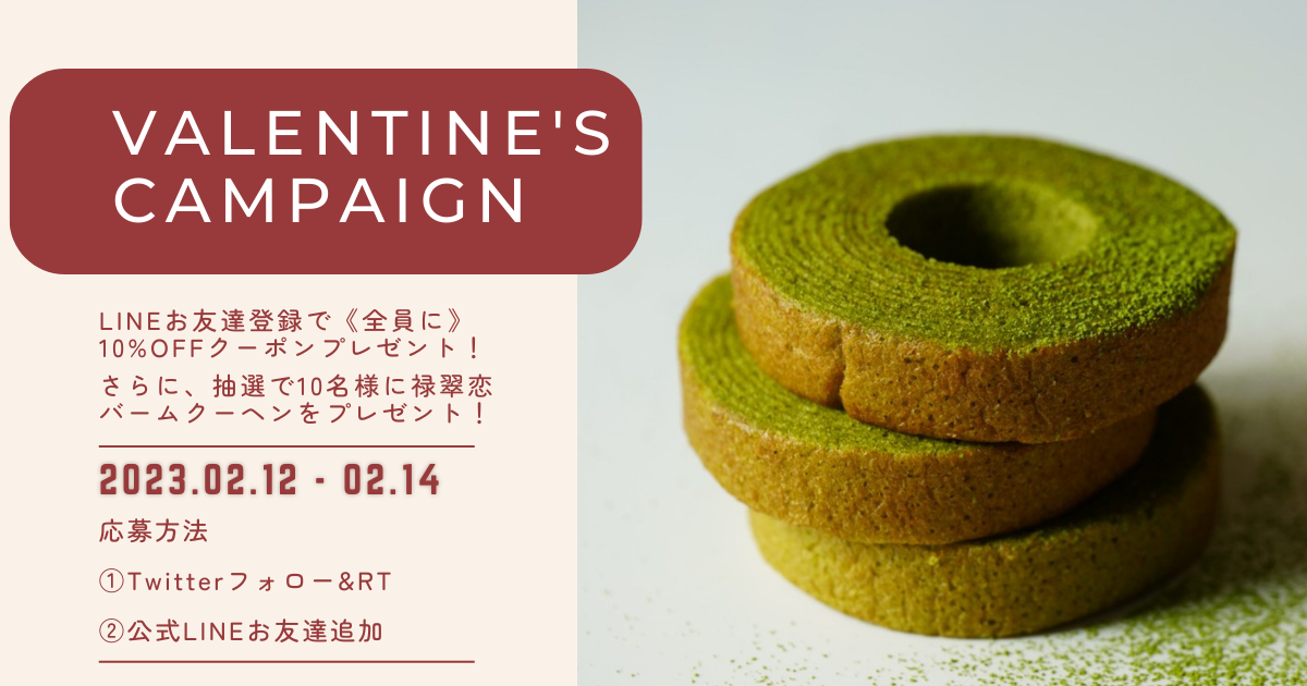 内容は公式LINEのお友達登録で《全員》に10%OFFクーポンをプレゼント!さらに、禄翠恋のTwitterをフォロー&バレンタインキャンペーンの投稿をRTしてくださった方の中から抽選で10名様に禄翠恋のバームクーヘンをプレゼント致します!