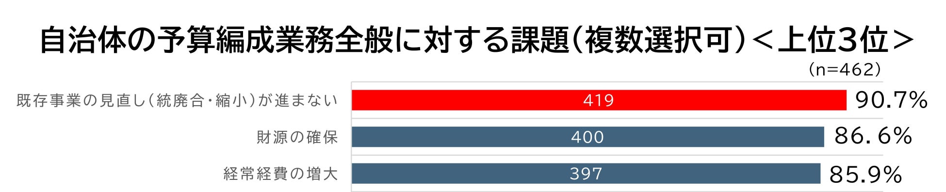 さらに、財ラボが自治体財政部門を対象として2024年秋に実施した最新のアンケート調査結果から、全国の自治体における予算編成業務の最大の課題は「既存事業の見直し(統廃合・縮小)が進まない」ことであると特定され、解決に向けた取り組みの必要性が強く認識されるに至りました。