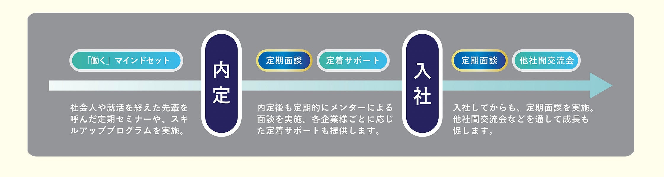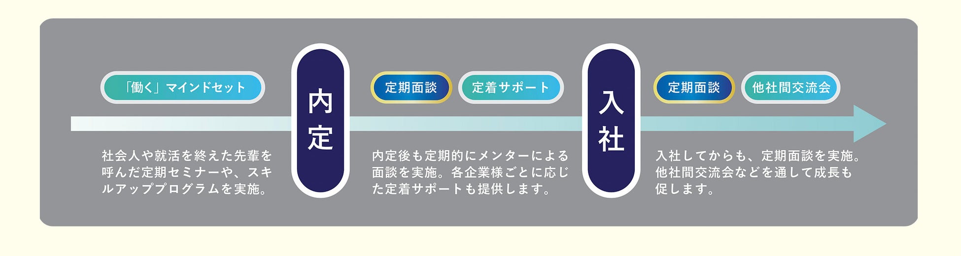 内定辞退率や早期離職率の高まりを抑えるため、入社前後の定着フォローをおこないます。入社前は定期的な面談や各企業ごとに応じた定着サポートを提供します。入社後も定期的な面談を実施したり、他社間交流会などを通じて成長を促すサポートを行います。