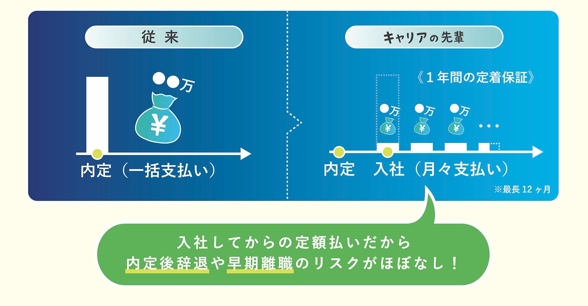一般的な就活エージェントでは成果報酬型のビジネスモデルが当たり前で、内定・入社が決まった際に一括で年収の30%〜50%を支払います。しかし、入社後にミスマッチが起きて早期離職しても、数ヶ月経てば返金がない場合がほとんどです。とりあえず入社させて利益を得ようとするエージェントも存在するため、学生側からすると入社後の活躍を考えずに無理なマッチングを促される場合もあります。そこでキャリアの先輩では、入社後に企業側から月額で料金をお支払いいただくビジネスモデルに設定しました。