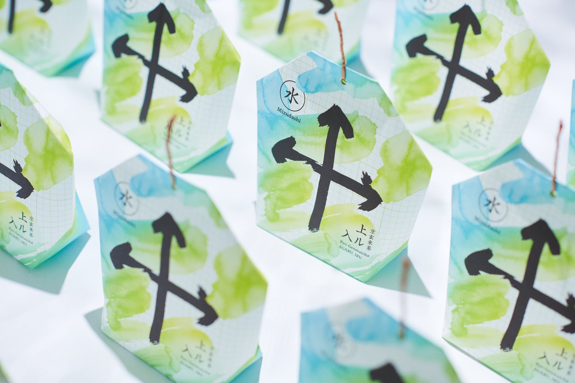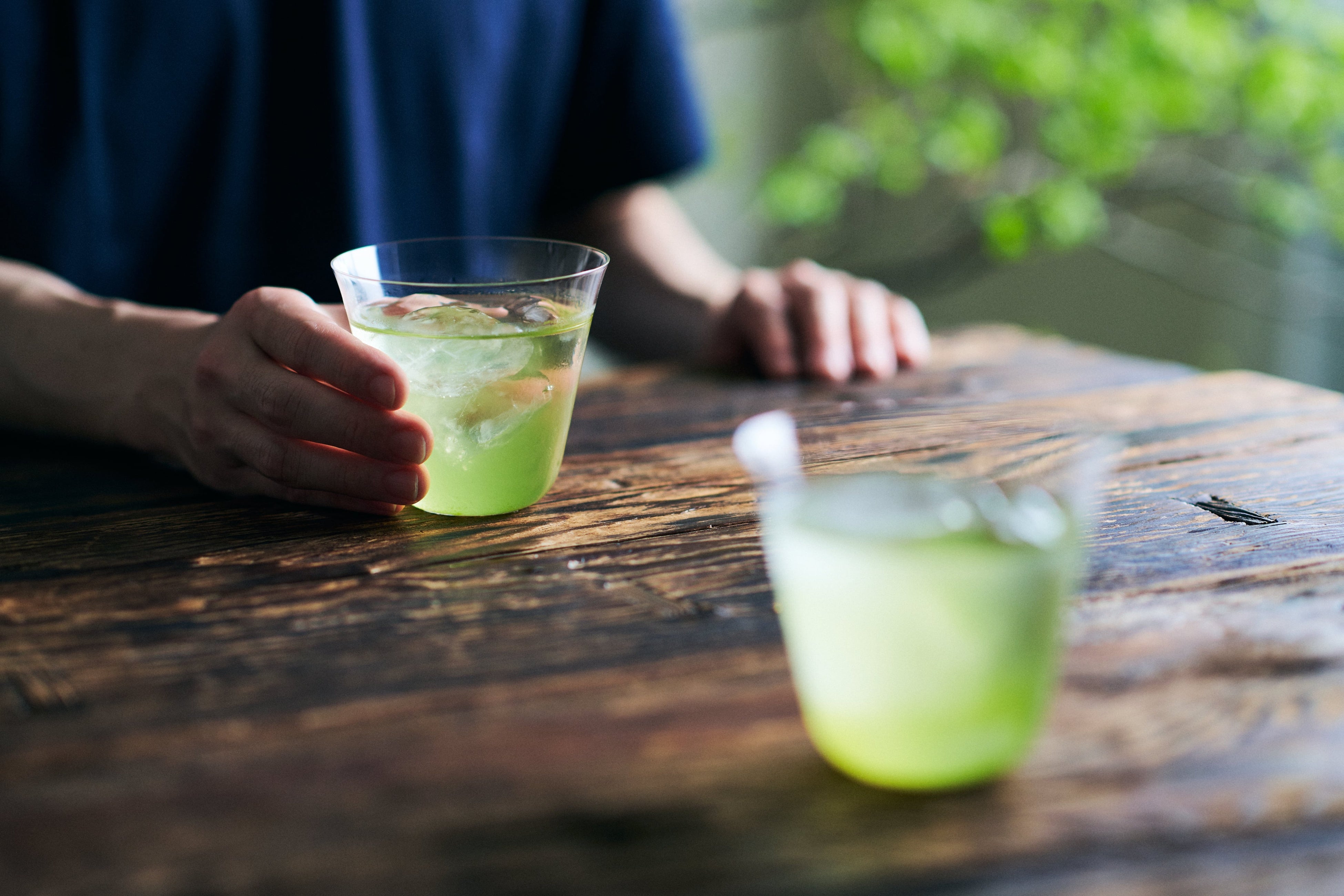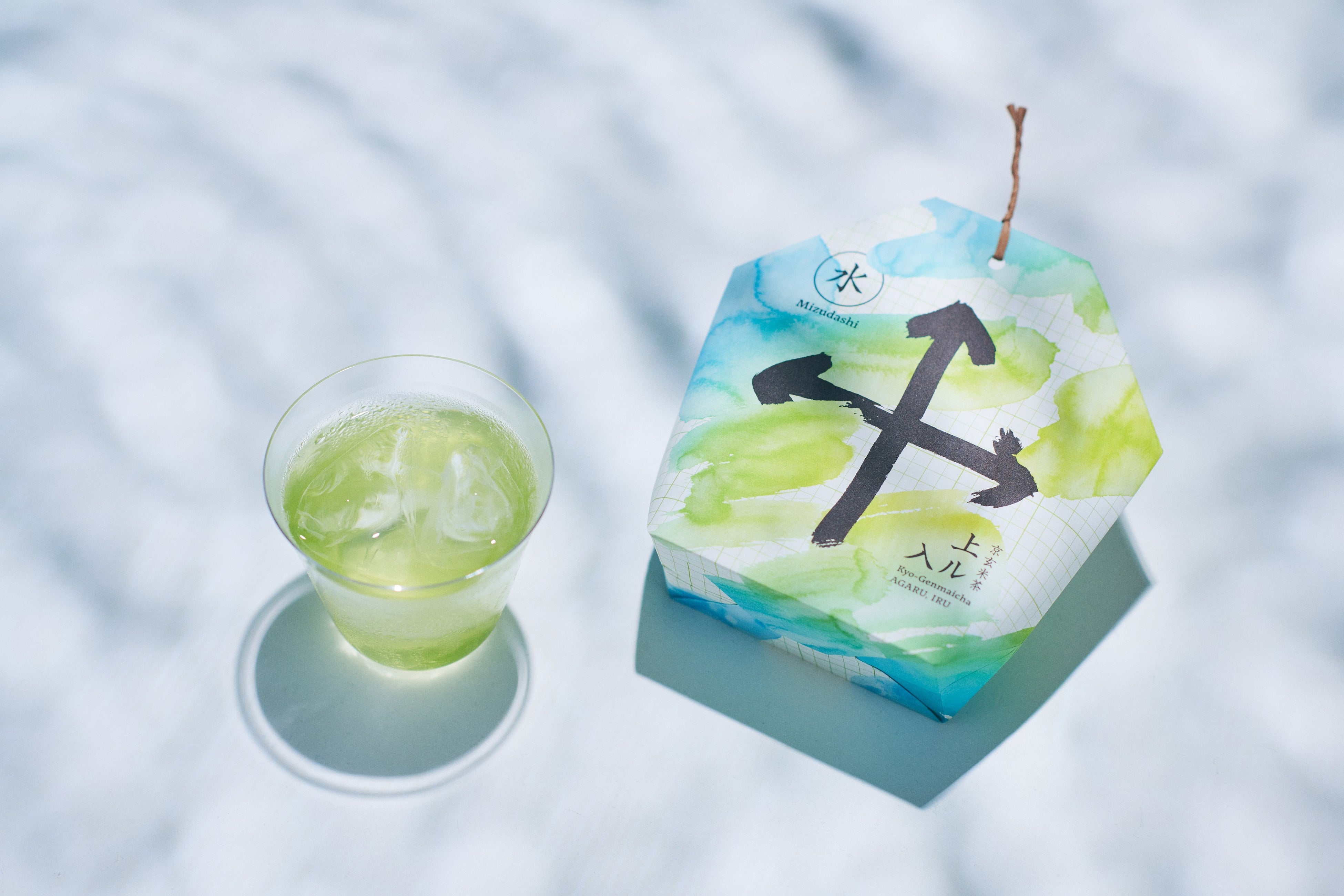 深蒸し茶とは、緑茶の製造工程のひとつである「蒸し」の時間を通常より長くとったお茶のこと。しっかりと蒸されることで茶葉が細かくなり、表面積が広がって抽出性があがるので、水で出しても旨みが濃厚に溶け出します。そこに石臼挽き宇治抹茶をブレンドすることで、見た目で涼を誘う鮮やかなグリーンを実現。京都の老舗米菓舗「鳴海屋」特製の「備長炭炭火炒り餅」のやさしい香ばしさはそのままに、夏限定の味わいが完成しました。キリっと冷えた水出し茶は、気温がアガルほどおいしくて、いっそう気分がアガル! 夏こそ飲みたい玄米茶です。