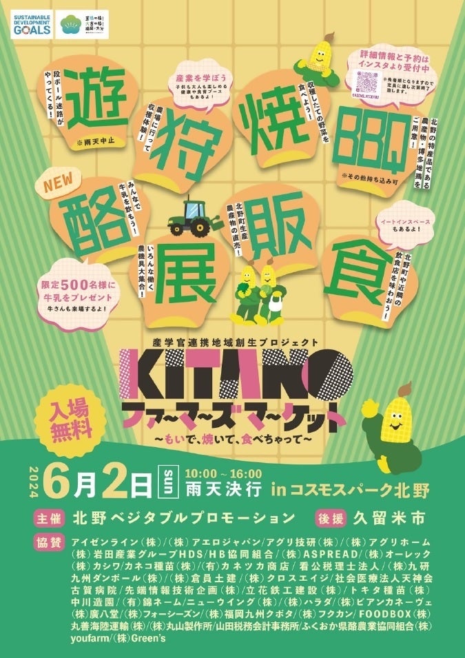 「北野ファーマーズマーケット」は、久留米市北野町の若手農家によるスイートコーンをメインにした収穫イベントです。スイートコーンの収穫体験(1本250円)やトラクターなどの乗車体験をはじめ、牛乳の無料配布、農産物の直売など盛りだくさん。また、飲食店の出店やダンボール迷路などもあり、大人も子どもも一日楽しめるイベントです。