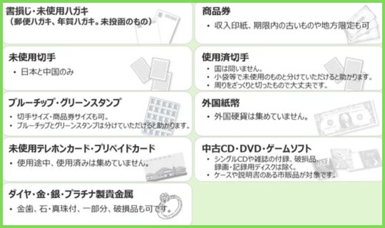 ハガキや切手の他、商品券、外国紙幣、CD・DVD・ゲームソフト等も寄付できます!